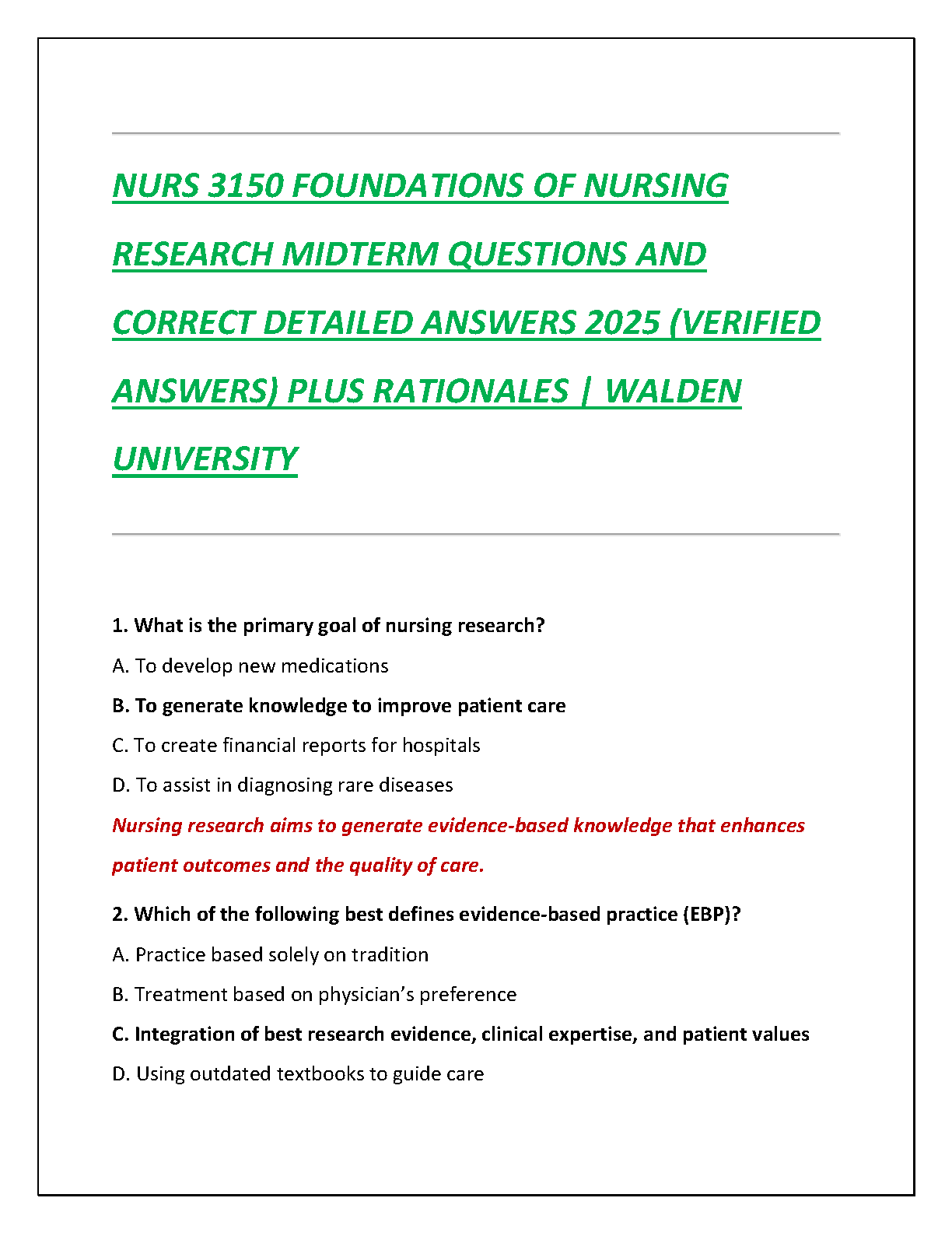 NURS 3150 Foundations of Nursing Research Midterm Exam Test Bank 2025 - Walden University | Questions, Correct Answers & In-depth Rationales