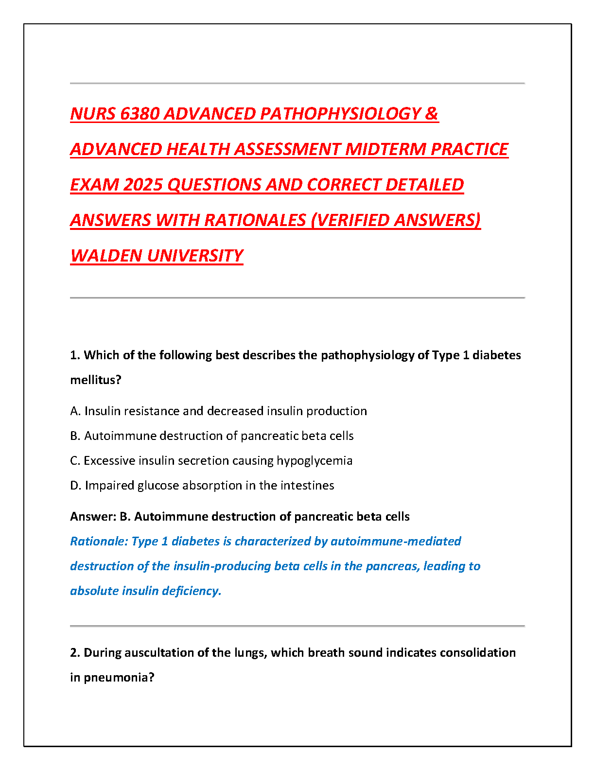 Unlock academic success in your NURS 6380 course at Walden University with this comprehensive test bank for the Advanced Pathophysiology & Advanced Health Assessment Midterm Exam. Updated for 2025, this guide features a full set of practice questions, complete with verified answers and detailed rationales. Each rationale is crafted to deepen your understanding of complex concepts, ensuring you're not just memorizing answers but truly learning the material. Master key topics, build confidence, and walk into your midterm fully prepared to achieve a top grade. This is the ultimate study resource to help you pass on your first attempt and excel in your nursing studies.