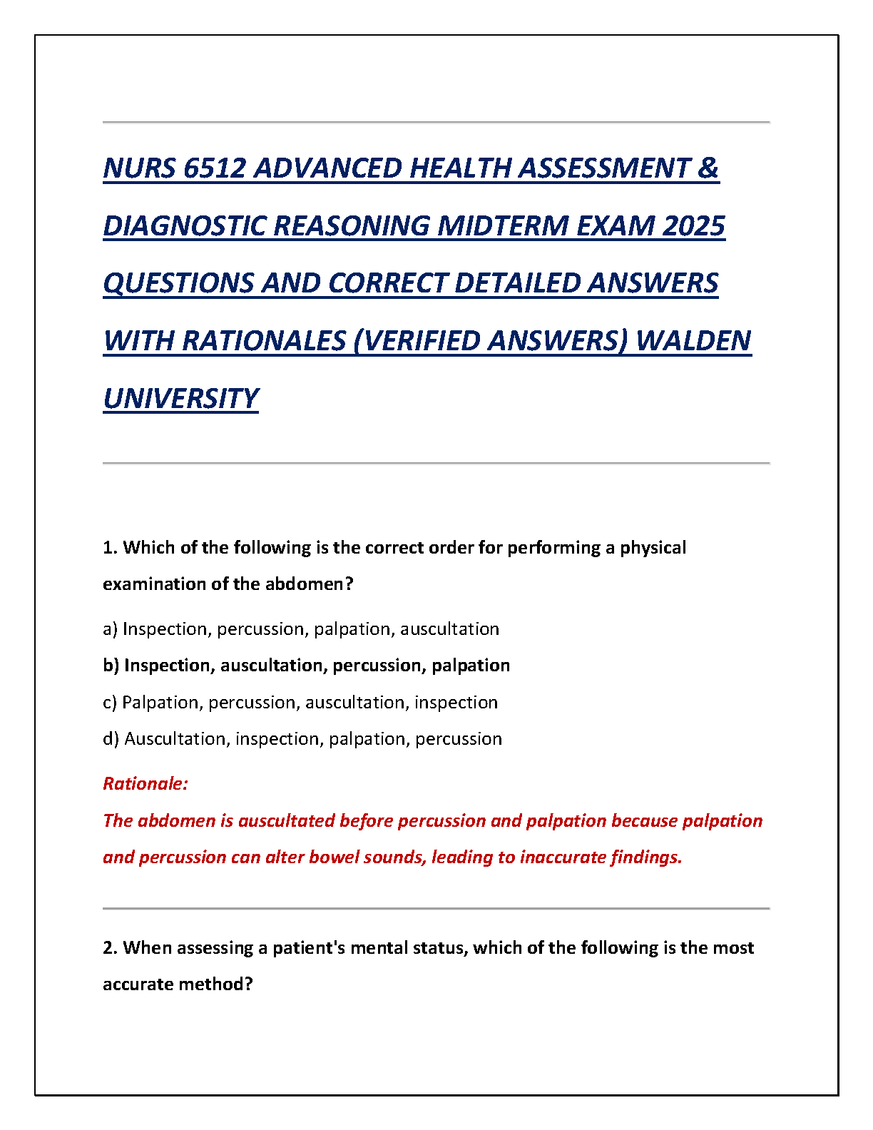 Ace your NURS 6512 Midterm Exam at Walden University with this comprehensive test bank for Advanced Health Assessment & Diagnostic Reasoning. This latest 2025/2026 resource is specifically aligned with the 4th Edition of the textbook by Joyce E. Dains, Linda Ciofu Baumann, and Pamela Scheibel. It features a complete collection of midterm exam questions, each with verified correct answers and in-depth rationales to ensure a thorough understanding of the material. Master key concepts, practice with exam-style questions, and build the confidence you need to pass on your first attempt. This is the ultimate study guide for achieving an A-grade in NURS 6512.