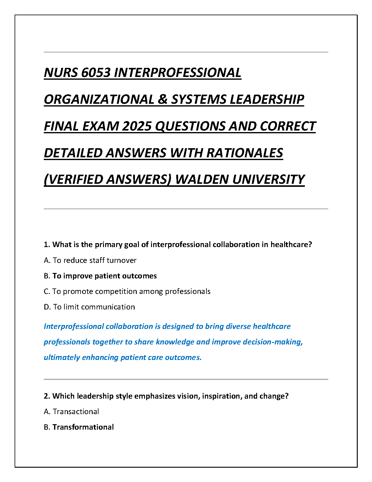 Master your NURS 6053 final exam with our newly released 2025 Test Bank for Walden University's Interprofessional Organizational & Systems Leadership course. This comprehensive study resource provides a complete set of exam questions, each paired with verified correct answers and in-depth rationales. Designed to deepen your understanding of key leadership principles and help you study effectively, this guide is your ultimate tool for passing the exam on your first try and excelling in your studies. Avoid resits and gain the confidence you need to succeed.