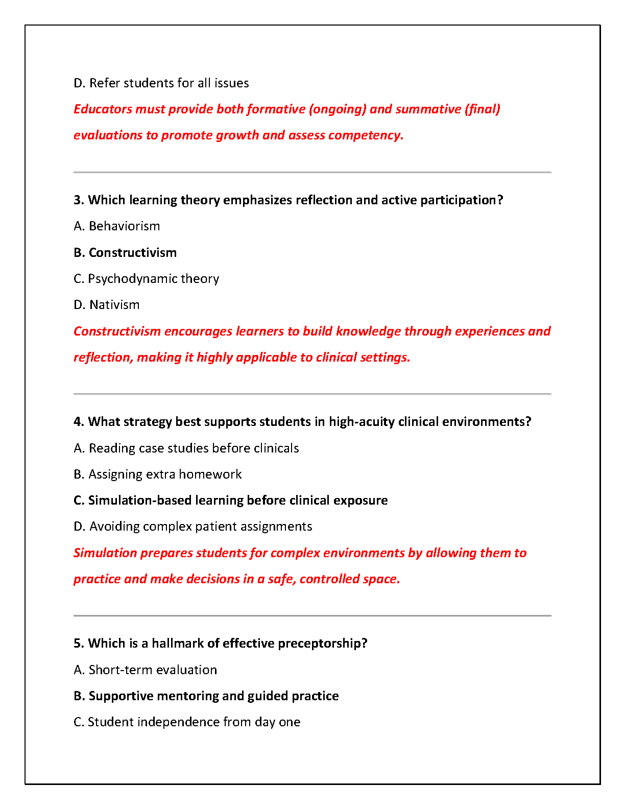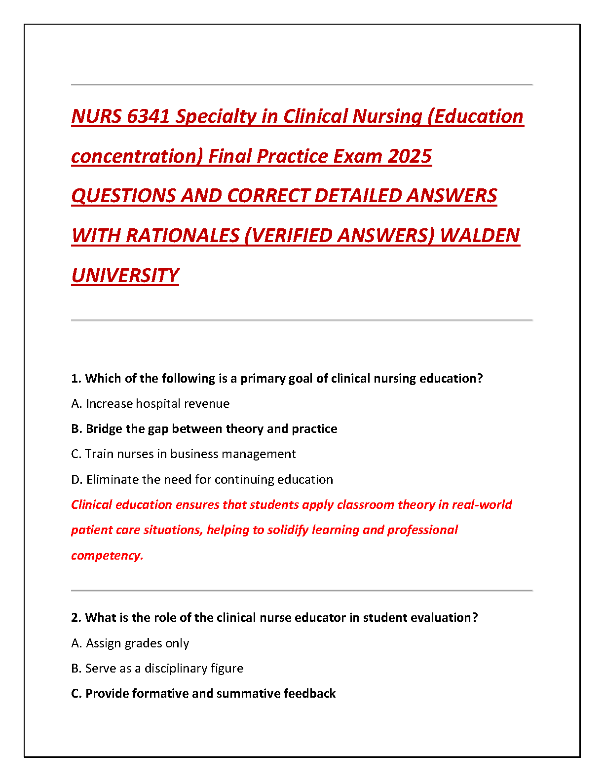 Prepare to ace your final exam for NURS 6341 Specialty in Clinical Nursing (Education concentration) at Walden University. This up-to-date 2025/2026 test bank is your ultimate study resource, containing a full set of practice questions with verified answers and detailed rationales. Each rationale is designed to deepen your understanding and bridge the gap between theoretical knowledge and practical application. Boost your exam preparation, solidify your professional competency, and achieve top grades with this comprehensive guide.