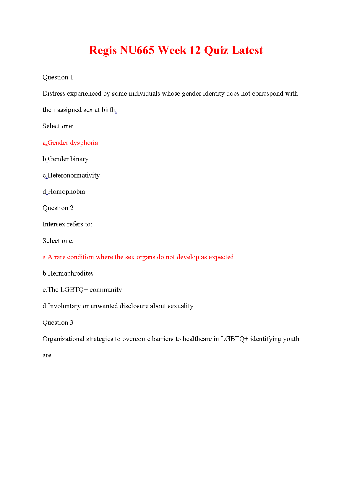 Unlock academic success in your Regis College NU665 course with our latest Week 12 Quiz, fully updated for the 2025/2026 term. This comprehensive study tool provides detailed questions and 100% correct, verified answers on essential topics including gender dysphoria, intersexuality, and overcoming barriers to healthcare for LGBTQ+ youth. Designed to help you grasp complex concepts and prepare thoroughly for your exams, this guide is your best bet for passing with confidence and achieving an excellent grade. Get instant access and start studying effectively today!