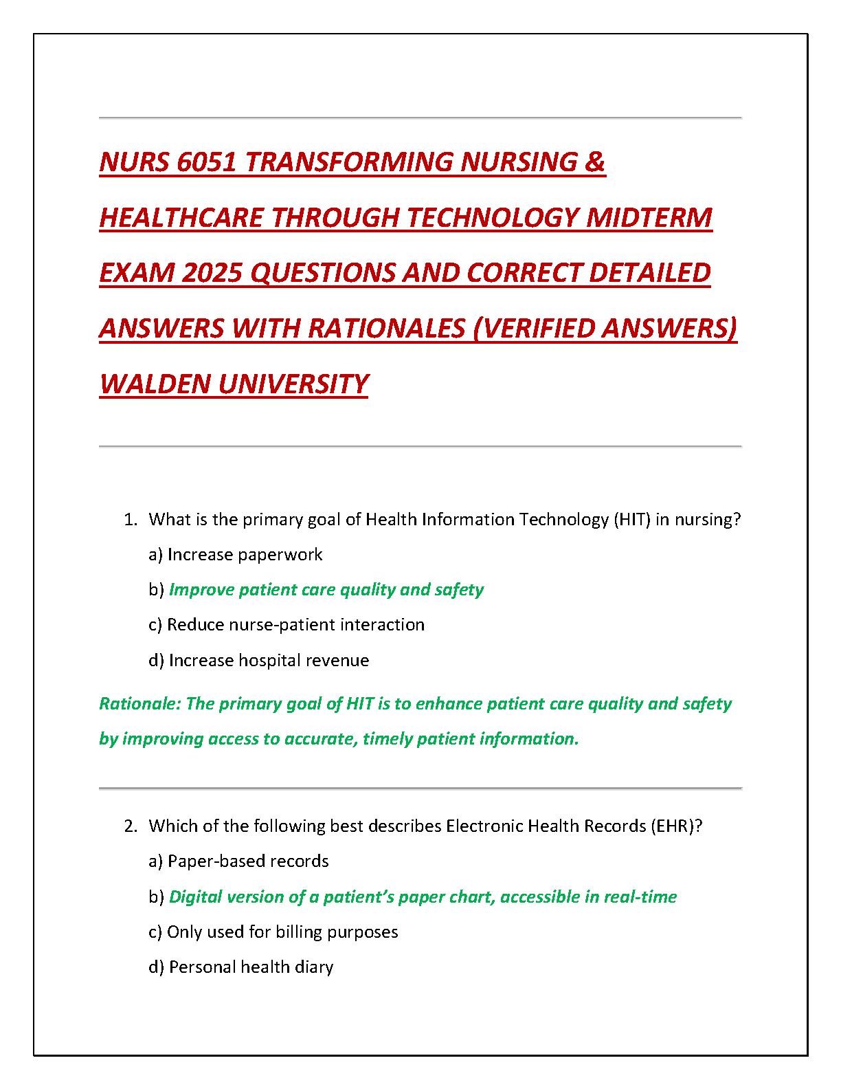 Excel in your NURS 6051 midterm at Walden University with our comprehensive test bank, fully updated for 2025/2026. This essential study guide for 'Transforming Nursing & Healthcare Through Technology' provides a complete set of exam questions with verified answers and detailed rationales. Aligned with the textbook 'Nursing Informatics and the Foundation of Knowledge, 5th Edition' by McGonigle & Mastrian, this resource is designed to help you master key concepts and achieve top grades. Download now for immediate access to verified material and study with confidence.