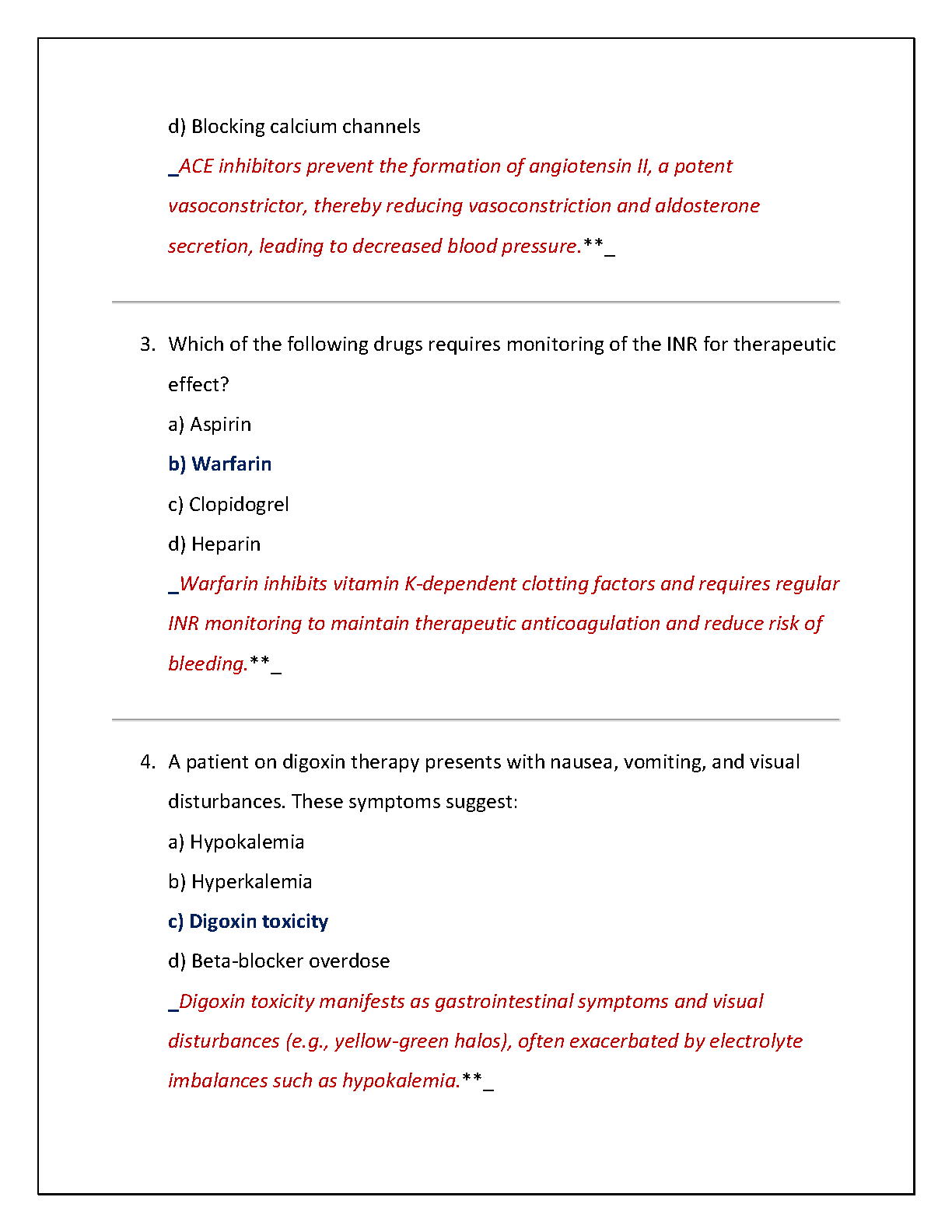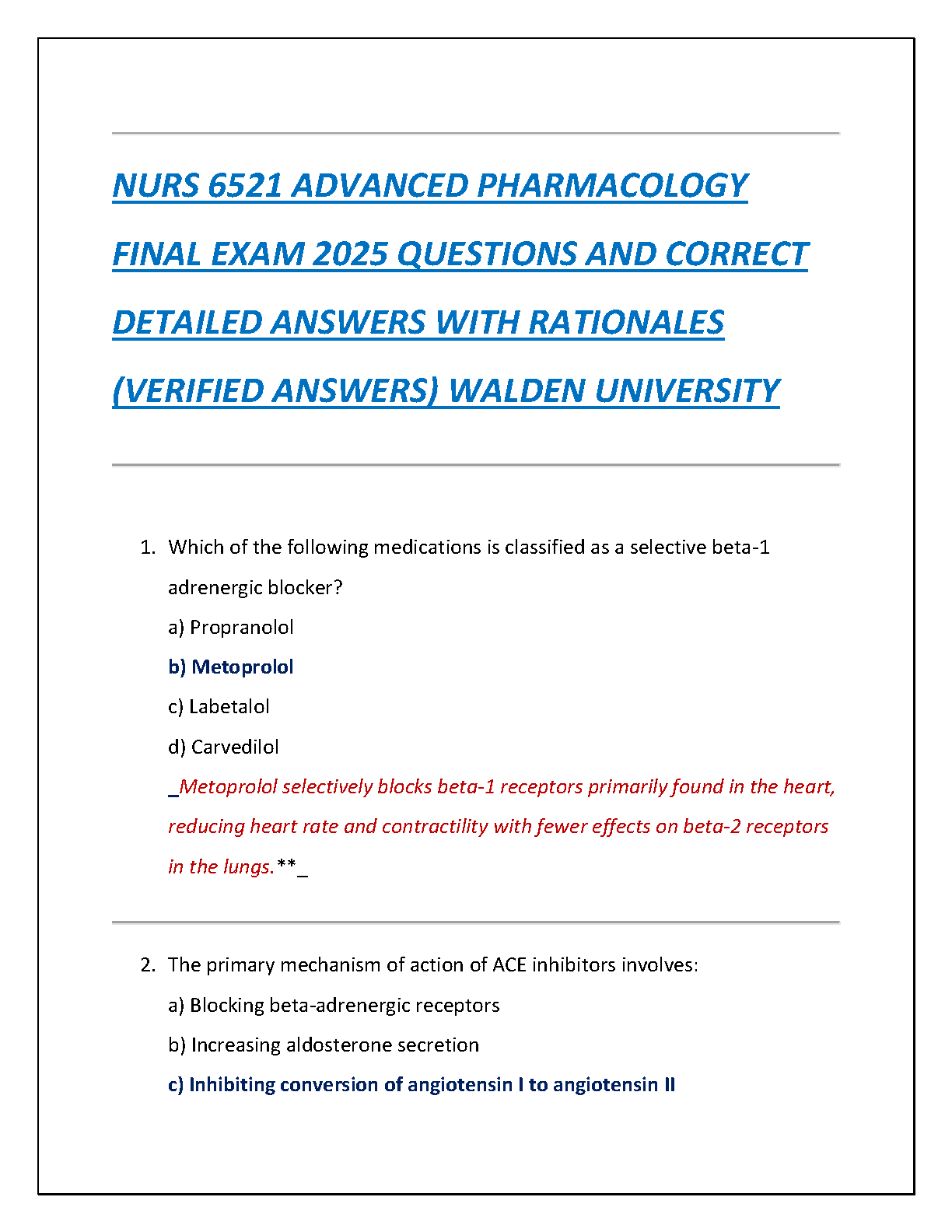 Ace your NURS 6521 Advanced Pharmacology final exam with this comprehensive and verified test bank for the 2025 academic year, specifically tailored for Walden University students. This essential study resource provides an extensive collection of exam-style questions, each accompanied by a correct answer and a detailed, in-depth rationale. Go beyond simple memorization and gain a true understanding of complex pharmacological principles, from drug classifications like beta-blockers and ACE inhibitors to their mechanisms of action. This test bank, aligned with key concepts from leading textbooks like Woo and Robinson's 'Pharmacology for Advanced Practice Prescribers,' is your key to mastering the material, boosting your confidence, and passing your final exam with flying colors on your first attempt. Download now and take the stress out of studying!