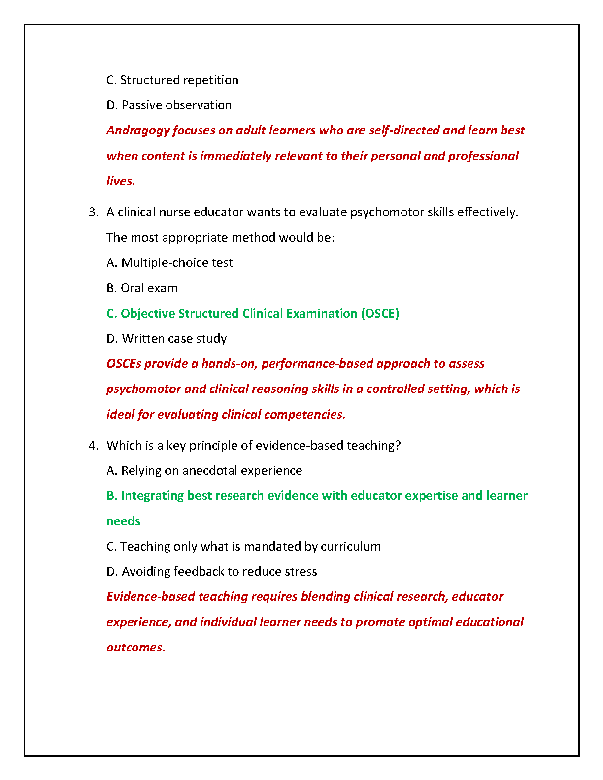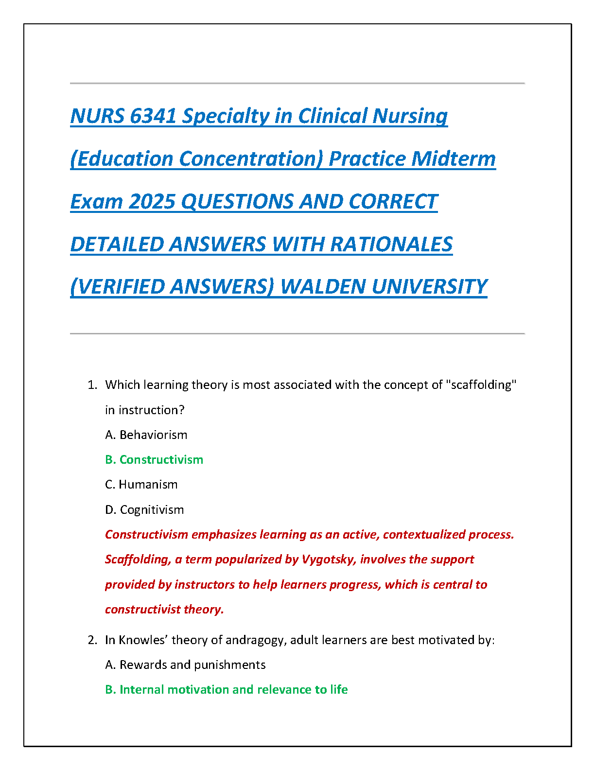 Ace your NURS 6341 Midterm Exam with this comprehensive and up-to-date practice test bank for Walden University's Specialty in Clinical Nursing (Education Concentration) course. This 2025/2026 guide is expertly designed to help you master the material and pass on your first attempt. Inside, you'll find a complete set of practice questions that mirror the actual exam format, each accompanied by a verified correct answer and a detailed rationale. These rationales are key to understanding the 'why' behind each answer, solidifying your knowledge of learning theories, andragogy, and other core concepts. Stop cramming and start studying smart. Download now to gain the confidence you need to excel in your nursing education specialty.