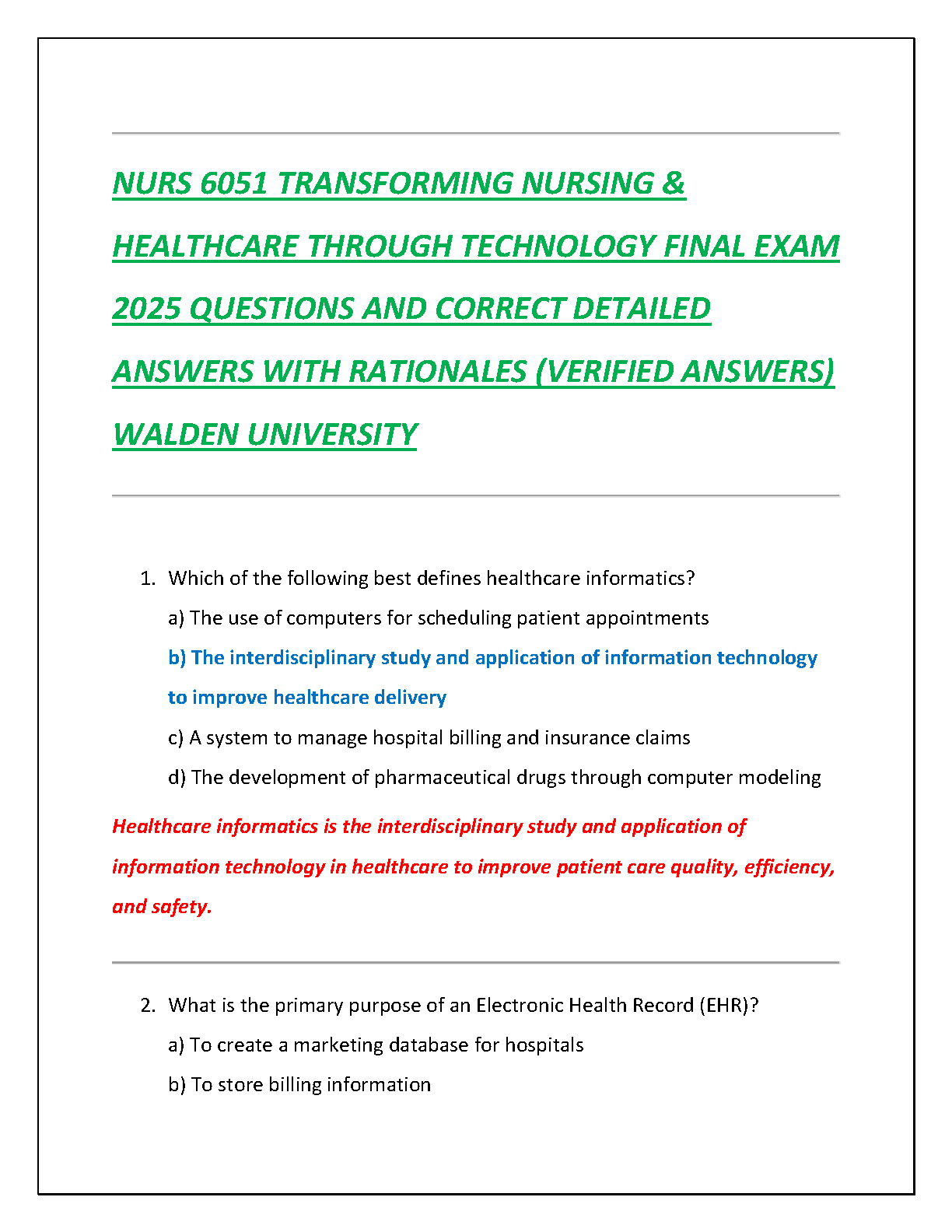 NURS 6051 Transforming Nursing & Healthcare Through Technology Final Exam Test Bank 2025 | Verified Questions and Answers with Rationales | Walden University