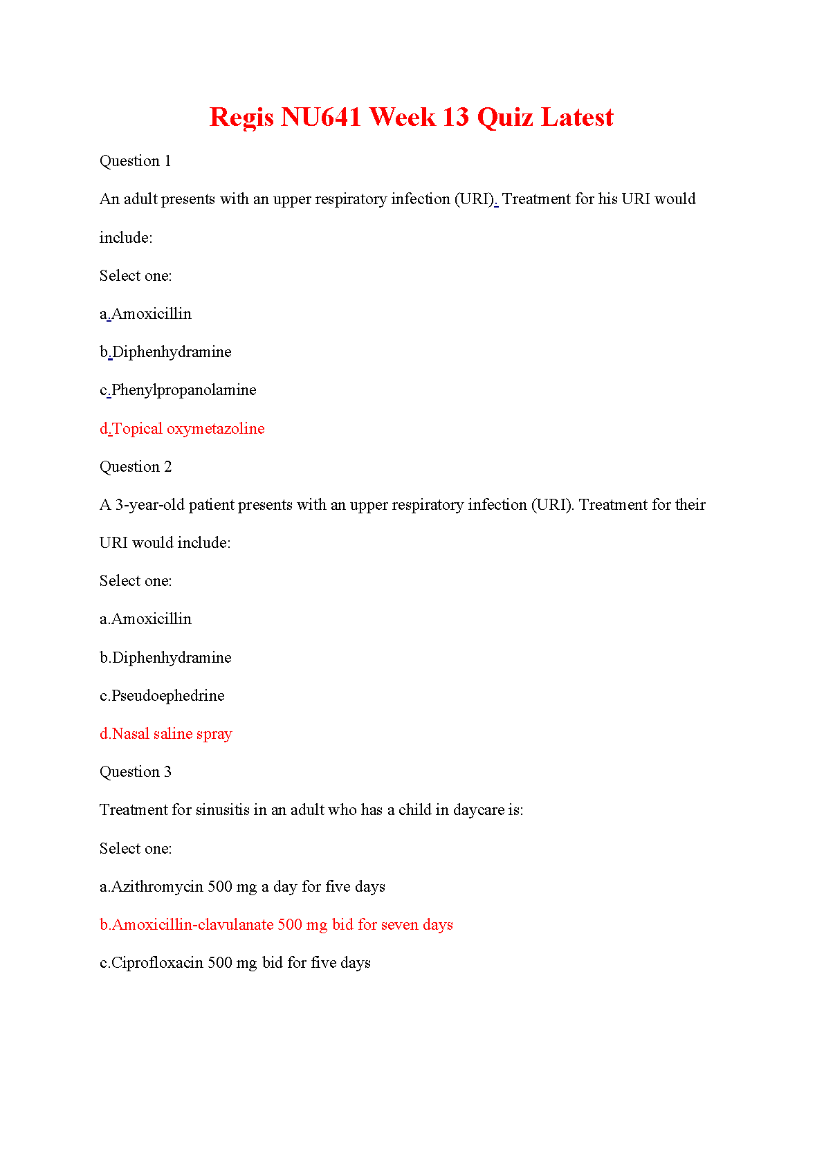 Ace your Regis College NU641 Advanced Pharmacology course with this latest Week 13 Quiz test bank. This comprehensive study guide provides a complete set of questions and verified answers covering key topics such as the treatment of Upper Respiratory Infections (URI) and sinusitis in both adult and pediatric patients. Master essential pharmacology concepts and be fully prepared for your exam. Download now to boost your grades and deepen your understanding of primary care pharmacotherapeutics.
