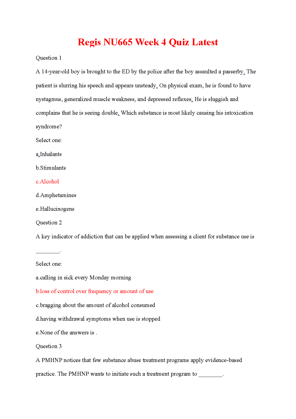 Get instant access to the latest 2025/2026 edition of the Regis NU665 Week 4 Quiz Test Bank. This comprehensive resource features a complete set of questions and expertly verified answers, covering crucial topics such as assessing substance intoxication, identifying key indicators of addiction, and applying evidence-based practices for PMHNPs. Designed to help you master the course material and excel in your exams, this study guide is your key to passing on the first attempt. Download now and confidently prepare for your NU665 Week 4 assessment.
