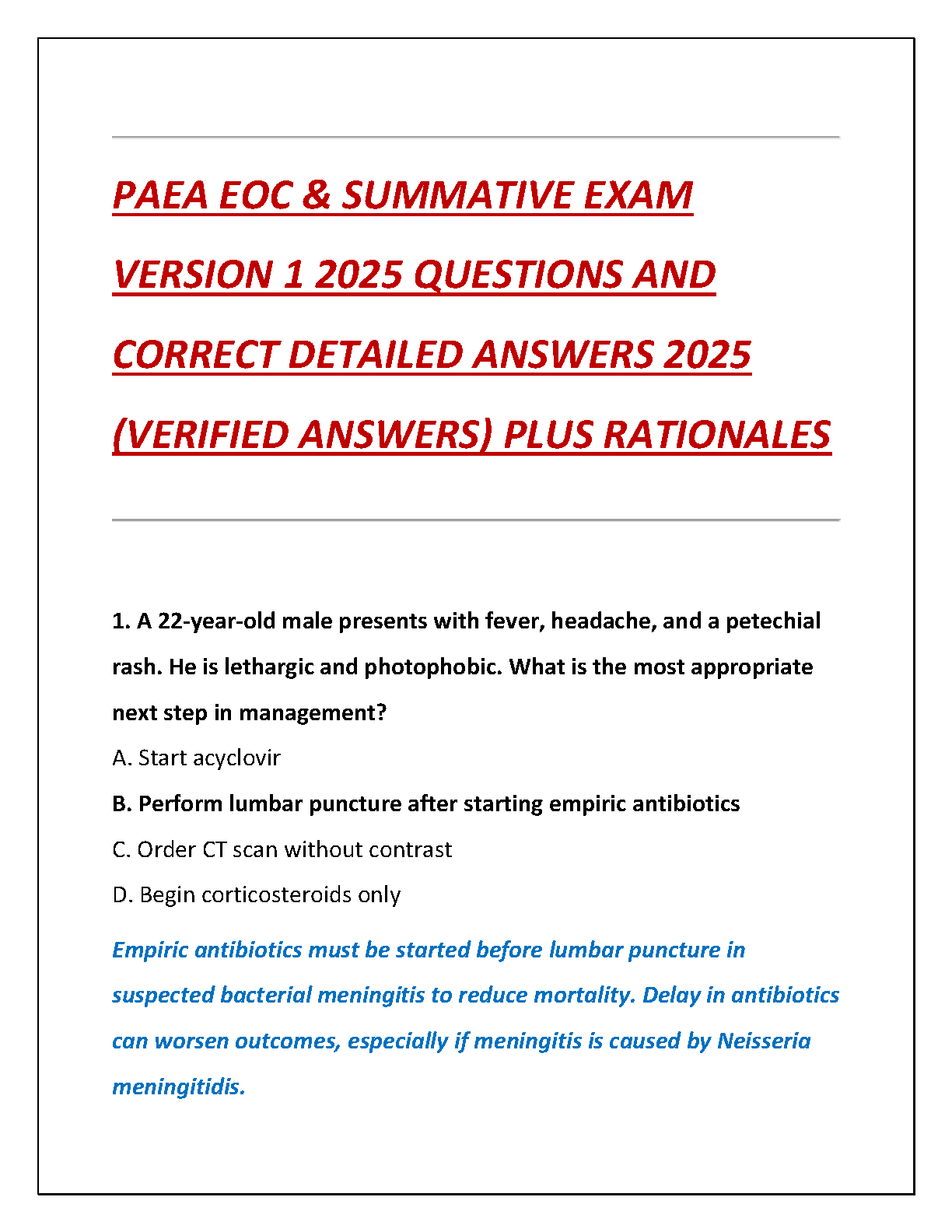 PAEA EOC & Summative Exam 2025 Test Bank - Version 1: Comprehensive Questions, Verified Answers, and Detailed Rationales