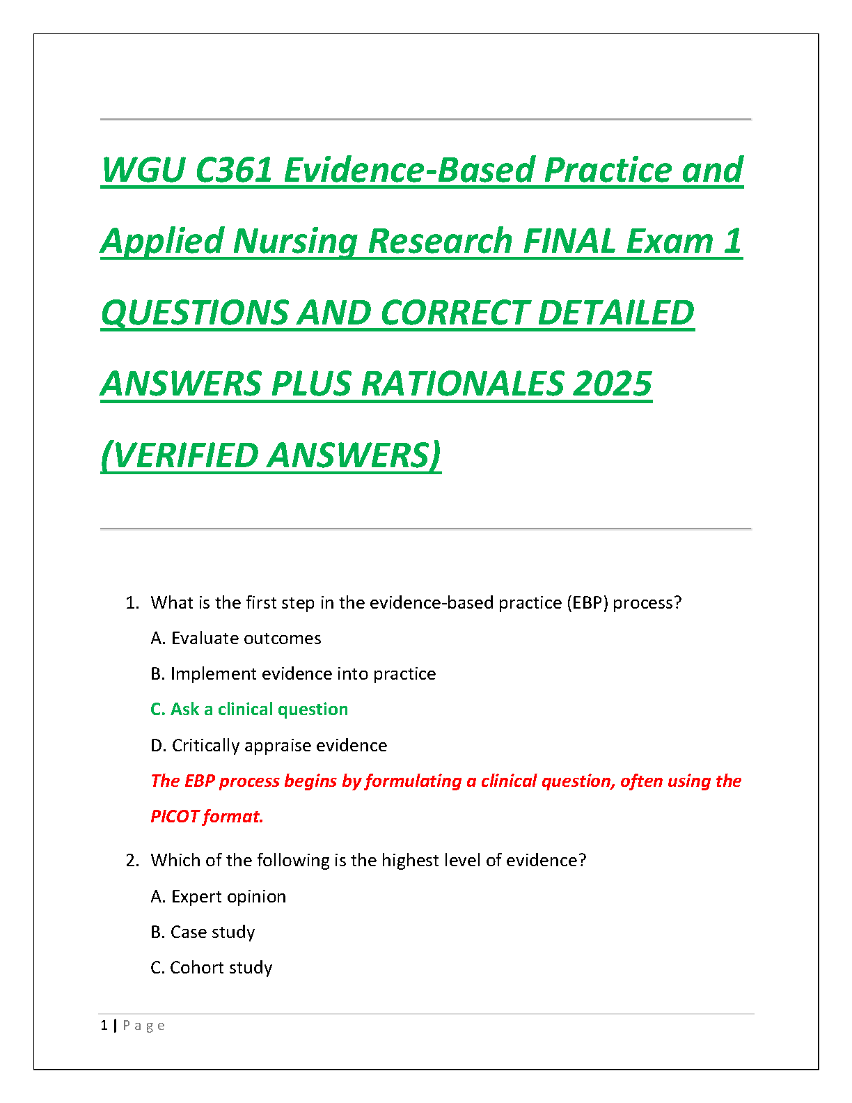 Ace your WGU C361 Final Exam for Evidence-Based Practice and Applied Nursing Research with our comprehensive 2025 test bank. This exam prep guide features a complete set of verified questions, accurate answers, and in-depth rationales for each solution. Designed to help you master key concepts and tackle the exam with confidence, this resource covers all essential topics to ensure you are fully prepared to pass on your first attempt. Get instant access and start studying smarter today!