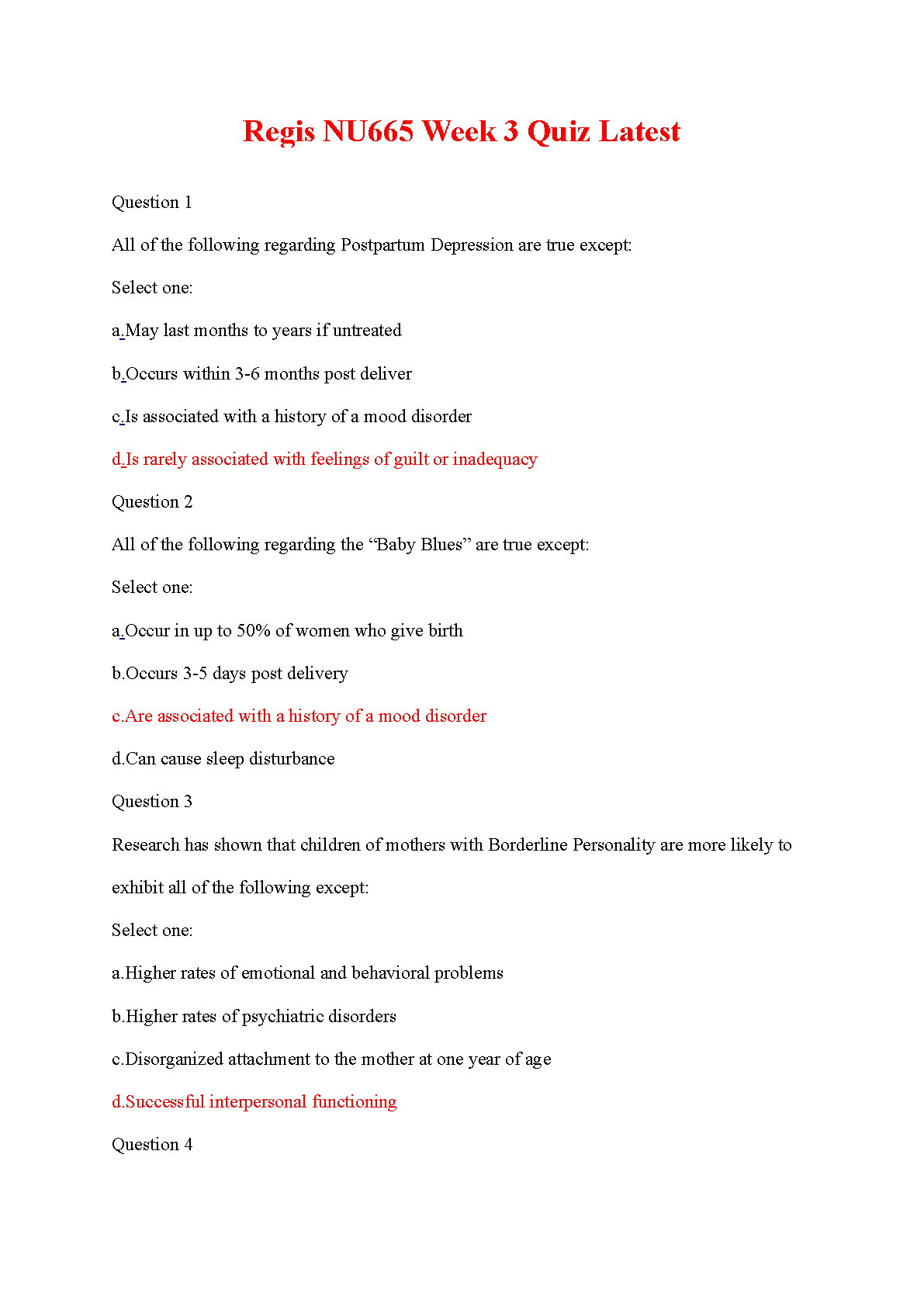 Master your Regis College Psychopharmacology course with this newly released 2025/2026 study guide for the NU665 Week 3 Quiz. This resource provides a complete set of questions with 100% correct, verified answers, focusing on crucial topics like Postpartum Depression, 'Baby Blues,' and the effects of Borderline Personality Disorder. Designed to help you understand key concepts thoroughly and excel in your exams, this guide is the perfect tool to ensure you pass on your first attempt and avoid costly resits.