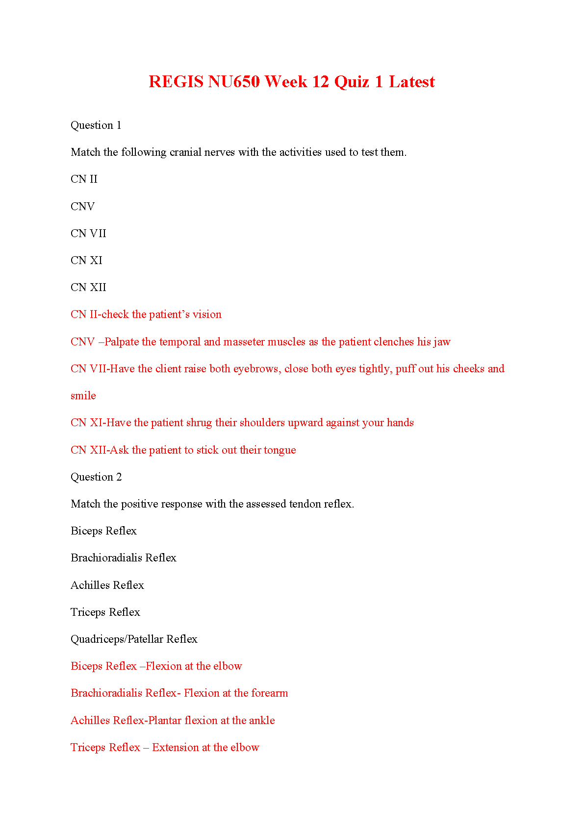 Ace your Advanced Health Assessment course with this comprehensive test bank for REGIS NU650 Week 12 Quiz 1. This latest 2025/2026 edition provides verified, 100% correct answers to help you master key neurological assessment concepts. The material covers detailed testing procedures for cranial nerves (CN II, CN V, CN VII, CN XI, CN XII) and the correct responses for major tendon reflexes, including Biceps, Brachioradialis, and Achilles. Download this essential study guide to prepare effectively, understand the material deeply, and pass your exam on the first attempt with confidence.