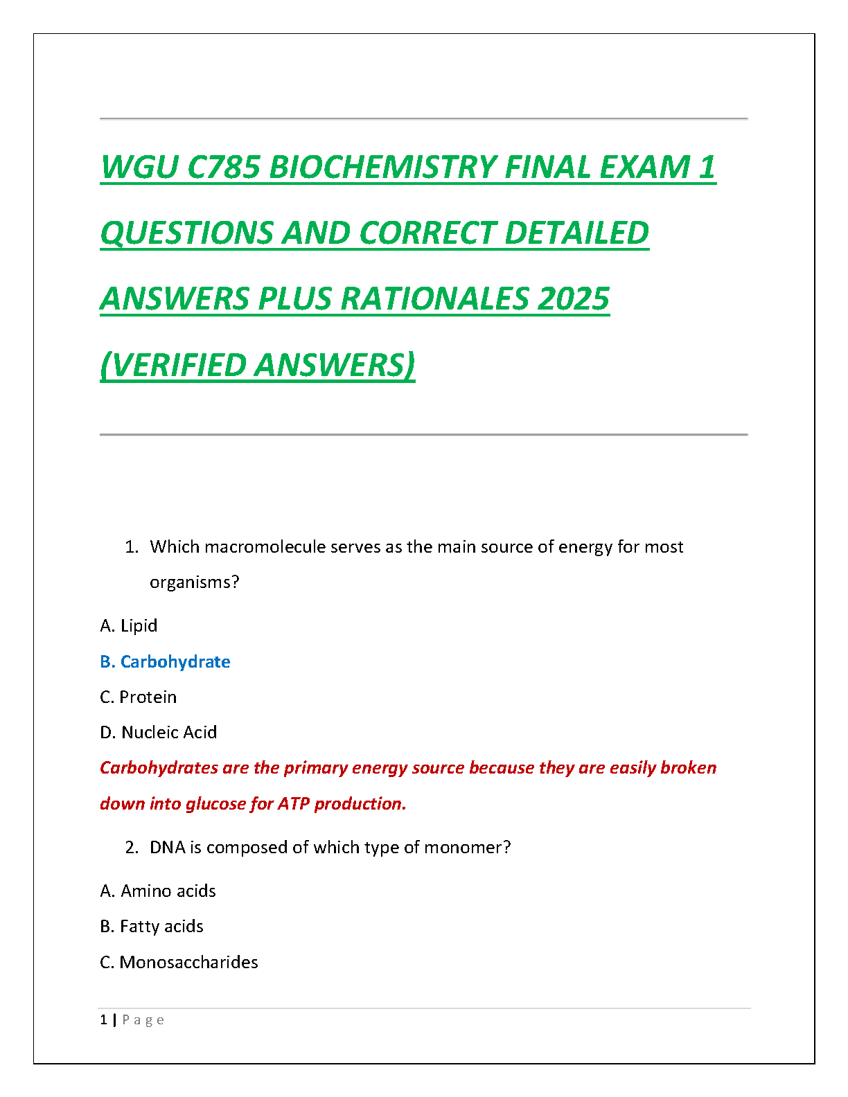 Ace your WGU C785 Biochemistry final exam with this comprehensive test bank for 2025. This study guide features a complete set of exam questions, each paired with a verified correct answer and a detailed, easy-to-understand rationale. Master the key concepts of biochemistry and build the confidence you need to pass your final exam on the first try. This resource is expertly designed to help you understand the 'why' behind each answer, ensuring thorough preparation and success in your WGU C785 course.