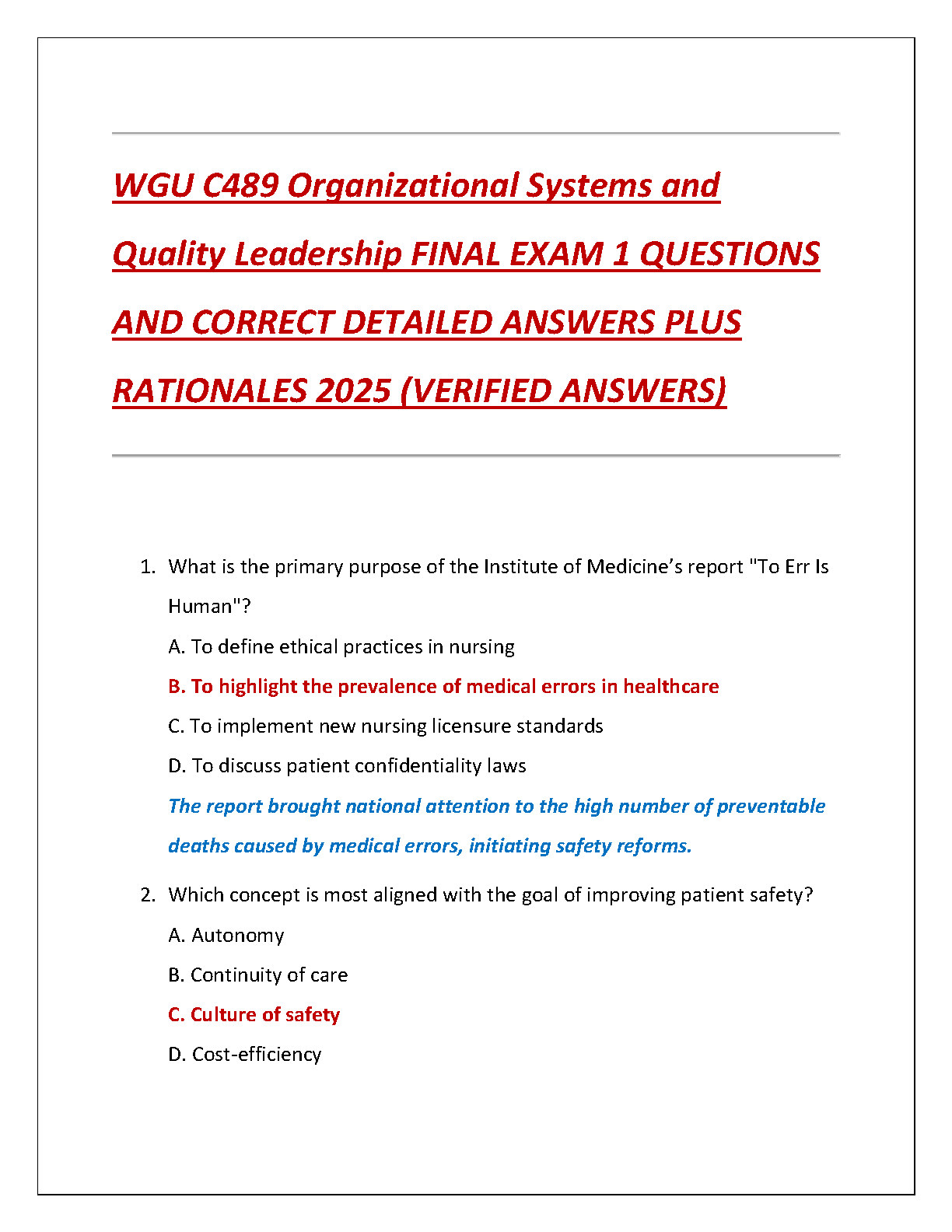 Master your WGU C489 final exam with our comprehensive test bank, updated for the 2025/2026 academic year. This essential guide features a complete set of questions from Final Exam 1, each with verified answers and detailed rationales. Dive deep into key concepts of organizational systems and quality leadership in healthcare. This resource is expertly crafted to help you study efficiently, build confidence, and pass your exam on the very first attempt, avoiding costly resits.