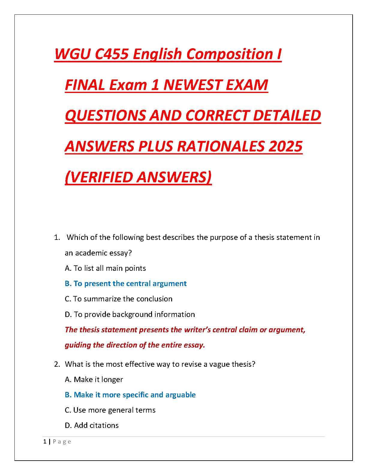 Ace your WGU C455 English Composition I Final Exam with our latest 2025 test bank. This comprehensive study guide includes a full set of verified questions, correct answers, and detailed rationales for Exam 1. Designed to help you master the course material and pass on your first attempt, this resource provides everything you need for success. Avoid resits and achieve a top grade with these expertly crafted exam preparations.
