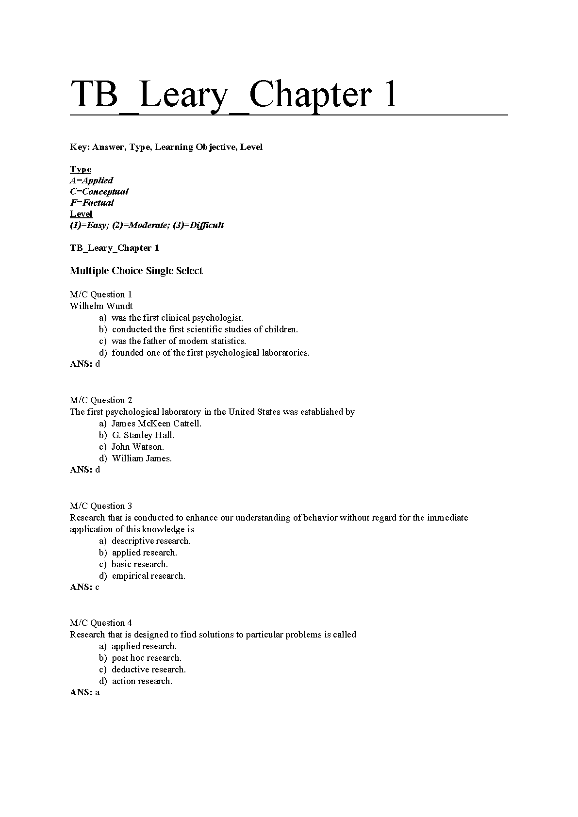 Test Bank for Introduction to Behavioral Research Methods, 7th Edition by Mark R. Leary