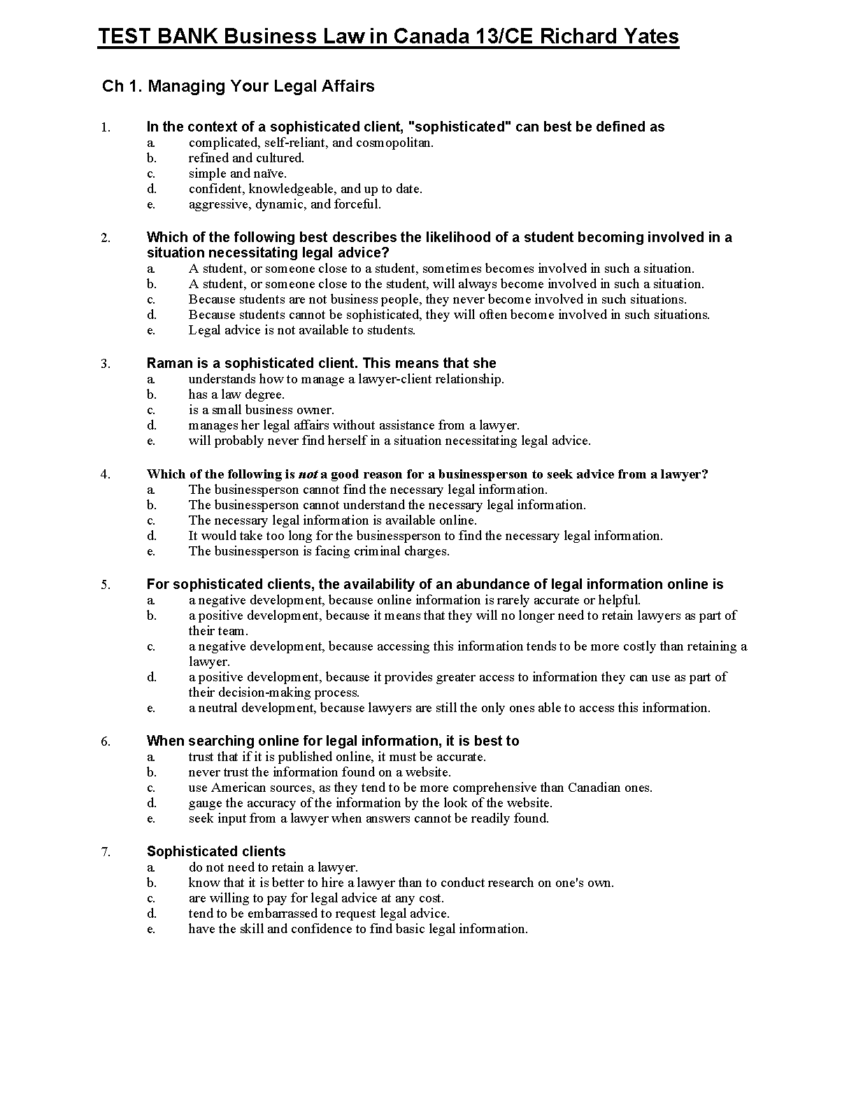 Unlock your full potential and master the complexities of Canadian business law with the official Test Bank for 'Business Law in Canada, 13th Canadian Edition'. This indispensable resource is packed with a comprehensive collection of exam-style questions, including multiple-choice, true/false, and short-answer formats, covering every chapter of the textbook. Designed to sharpen your understanding and test your knowledge, this test bank is the ultimate study tool for students aiming to excel in their exams and achieve top grades. Prepare effectively, identify areas for improvement, and walk into your exam with confidence.