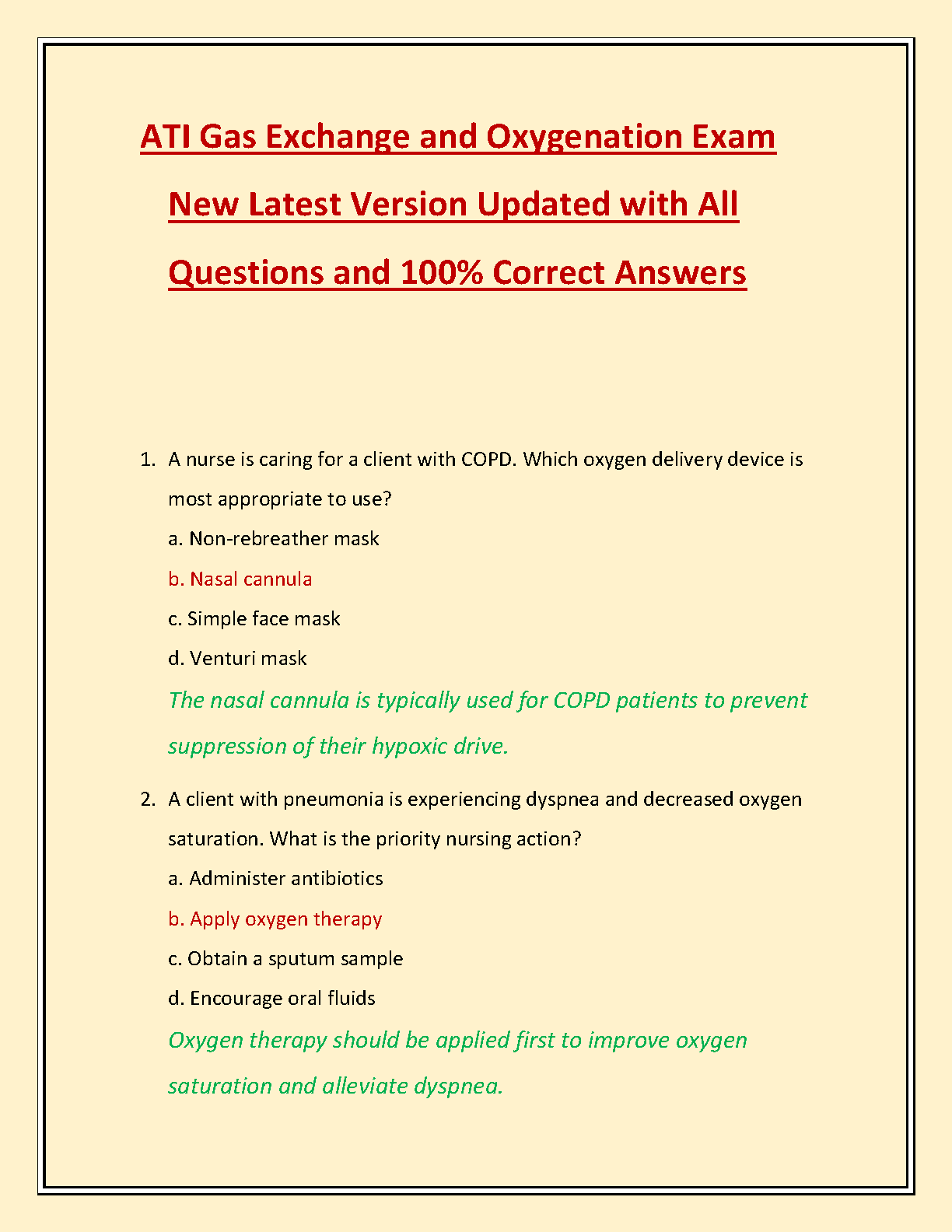Master the ATI Gas Exchange and Oxygenation exam with our comprehensive test bank, fully updated for the 2025/2026 academic year. This essential study guide features a complete collection of practice questions paired with 100% correct, verified answers and detailed rationales. Focus on critical nursing concepts, including patient care for COPD and pneumonia, to ensure you pass your exam on the first try and avoid resits. Elevate your preparation and walk into your exam with confidence.