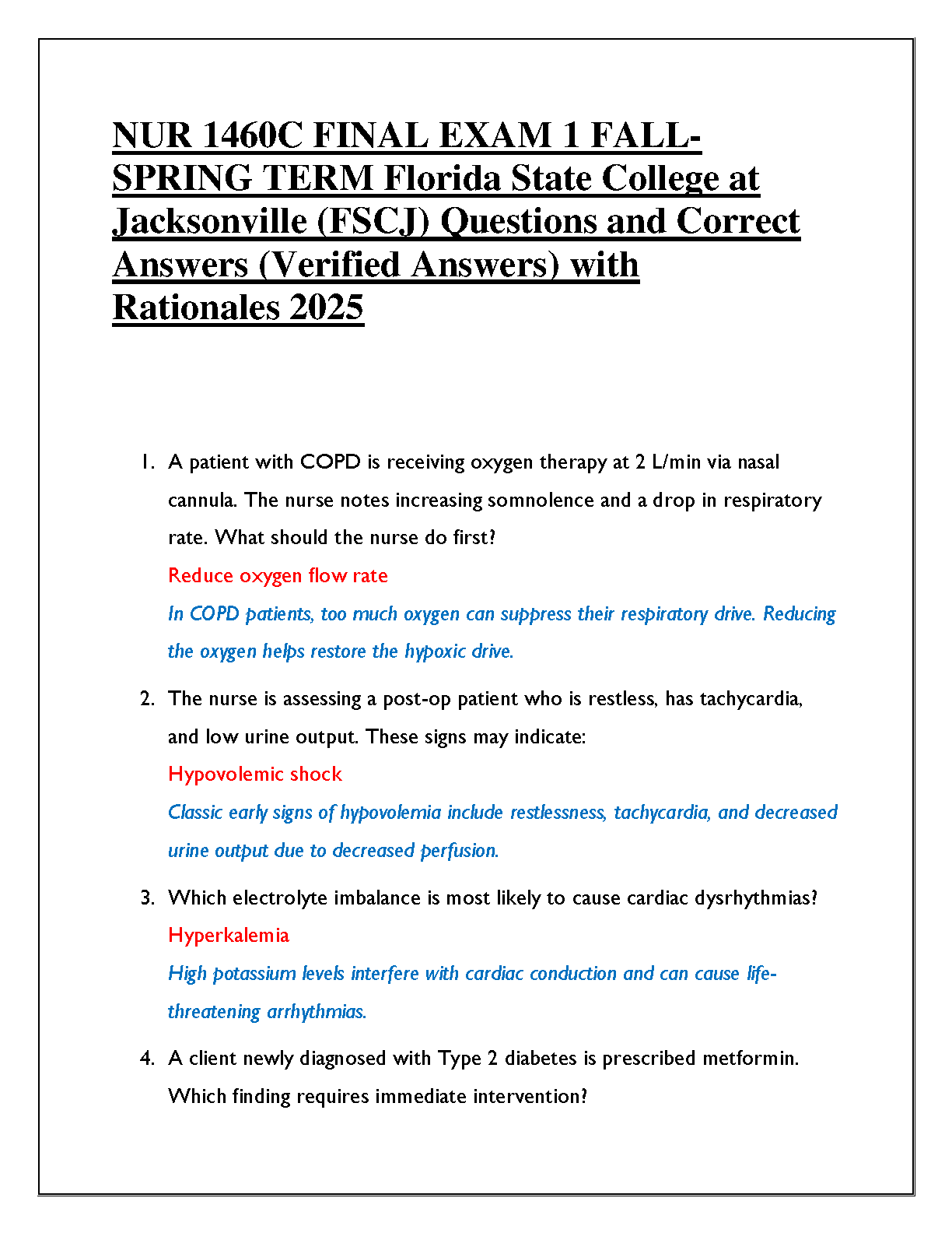 NUR 1460C Final Exam 1 Test Bank (2025 Edition) | Florida State College at Jacksonville (FSCJ) | Verified Questions, Answers, and Detailed Rationales