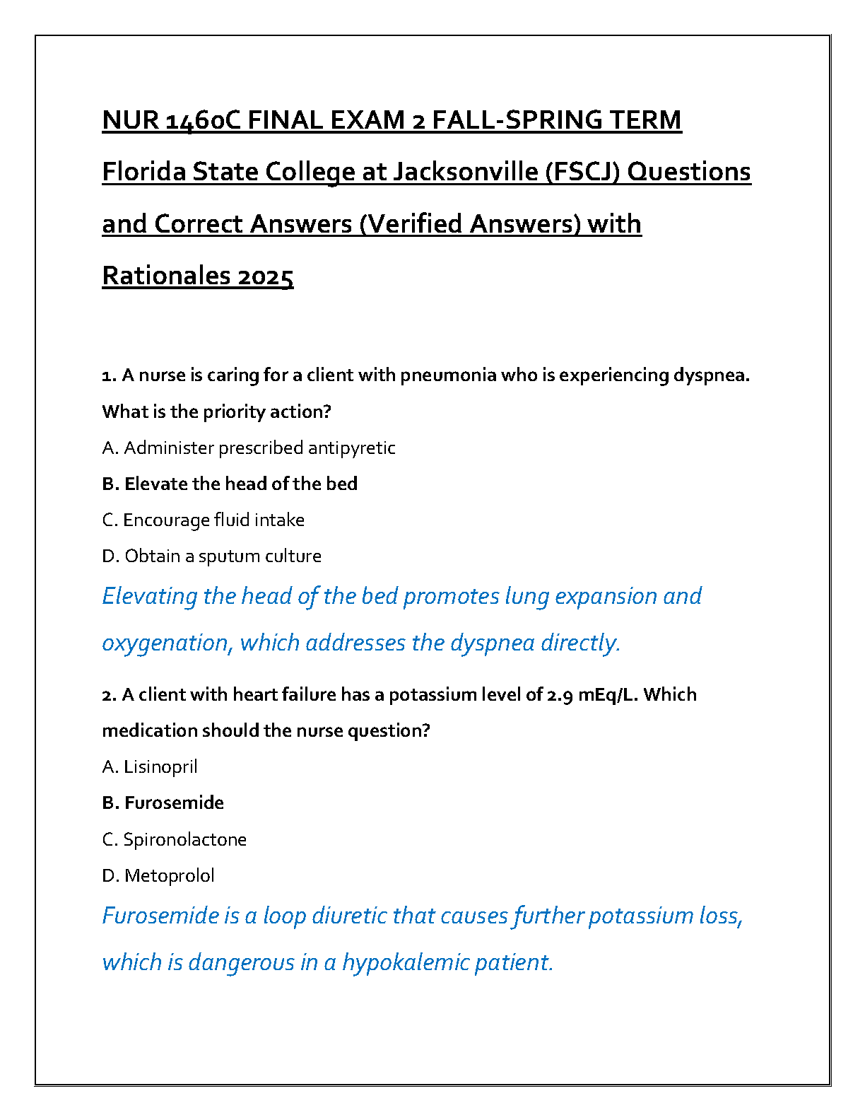 NUR 1460C Final Exam 2 Test Bank: Complete Questions, Verified Answers, and In-depth Rationales for FSCJ | 2025/2026 Edition