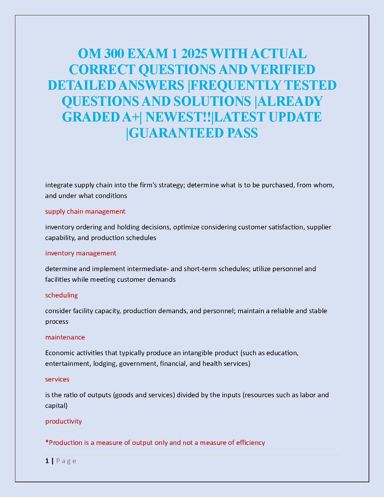 Get ready to ace your OM 300 Exam 1 with this complete Test Bank for Operations Management: Sustainability and Supply Chain Management, 14th Edition by Heizer, Render, and Munson. This guide features a collection of actual, frequently tested questions with detailed, verified answers, ensuring you grasp key concepts like supply chain integration, inventory management, and productivity. Designed to help you achieve an A+ grade, this resource is the ultimate tool for exam preparation. Download today for a guaranteed pass!