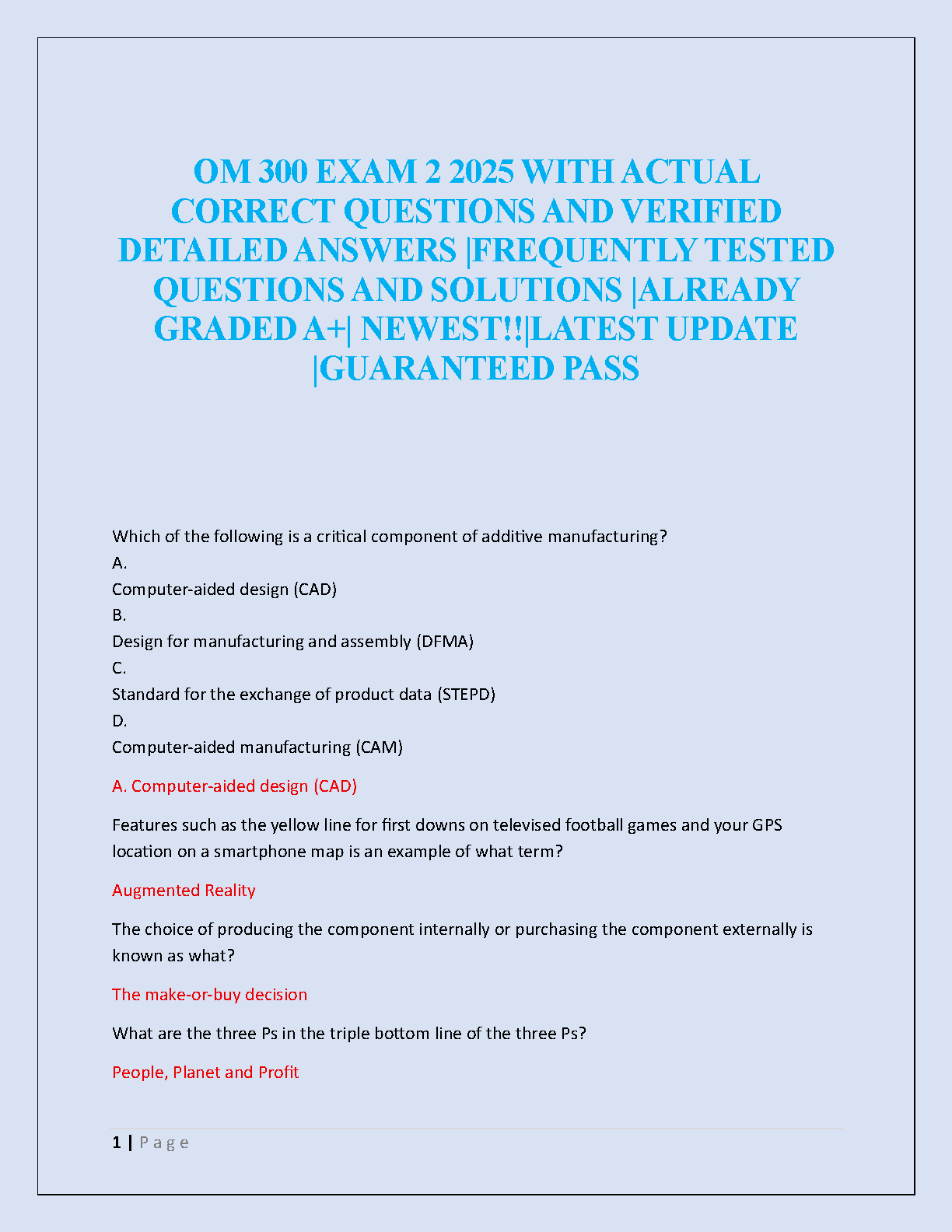 Ace your OM 300 Exam 2 with our comprehensive test bank for 'Operations Management: Sustainability and Supply Chain Management,' 14th Edition by Heizer, Render, and Munson. This meticulously curated resource features a collection of frequently tested questions, complete with verified, detailed answers and solutions. Each question is designed to reflect the actual exam format, ensuring you are fully prepared. Updated for the 2025/2026 academic year, this test bank is your key to achieving an A+ grade and passing on your first attempt. Covers key topics like additive manufacturing, augmented reality, make-or-buy decisions, and the triple bottom line.