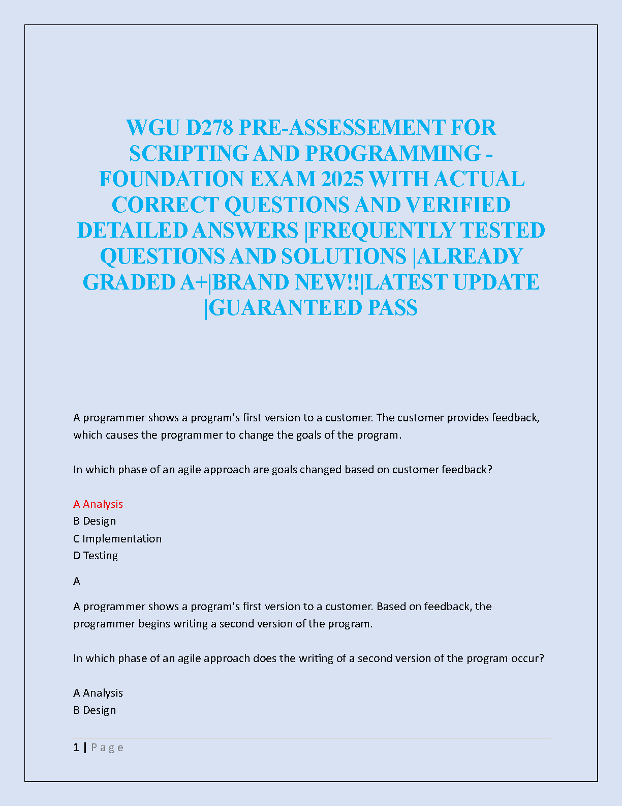 Ace your WGU D278 exam on the first attempt! This is the latest and most comprehensive test bank for the WGU D278 Scripting and Programming - Foundation Pre-Assessment, updated for the 2025 academic year. Inside, you'll find a complete collection of frequently tested questions, each accompanied by a verified, step-by-step answer. This resource is designed to mirror the actual exam, ensuring you are fully prepared for every topic. Master key concepts in agile methodology, programming fundamentals, and scripting with this A+ graded study guide. Stop worrying about resits and gain the confidence to pass with flying colors. Guaranteed success awaits!