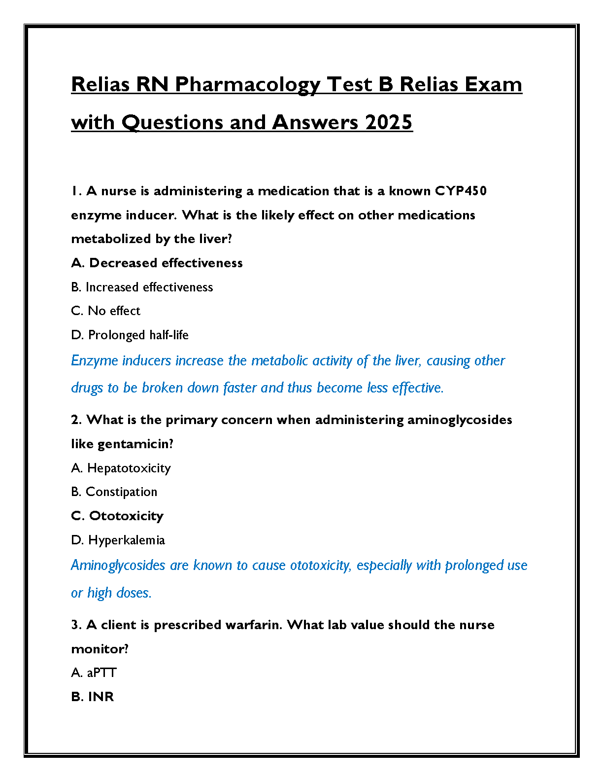 Prepare to ace your Relias RN Pharmacology exam with our latest 2025/2026 Test Bank! This comprehensive study guide is packed with practice questions and detailed answers that cover all the essential topics you need to know. Designed to mirror the actual exam format, this resource will help you master key pharmacological concepts, boost your confidence, and ensure you pass on your very first attempt. Say goodbye to exam anxiety and avoid costly resits by studying with the most up-to-date and reliable preparation tool available.