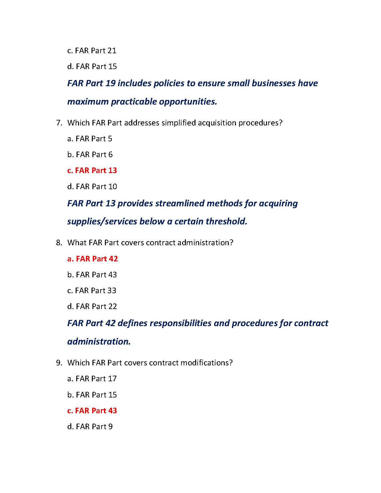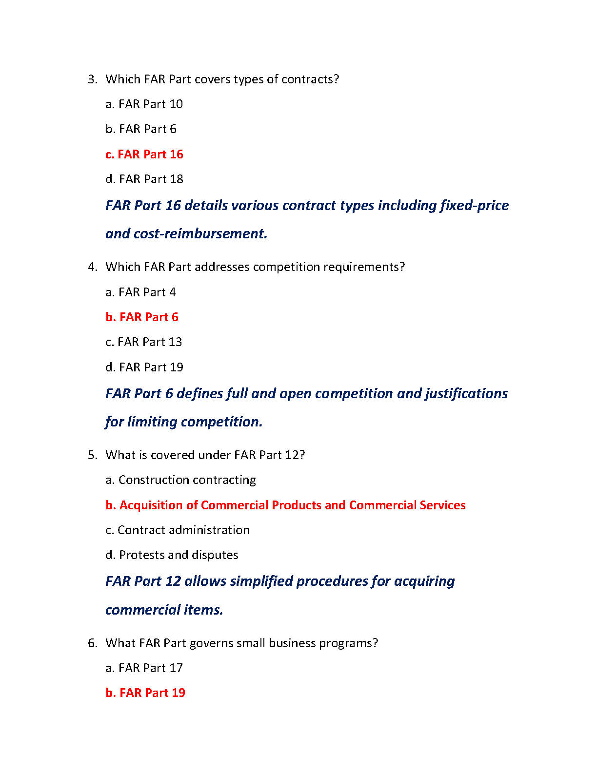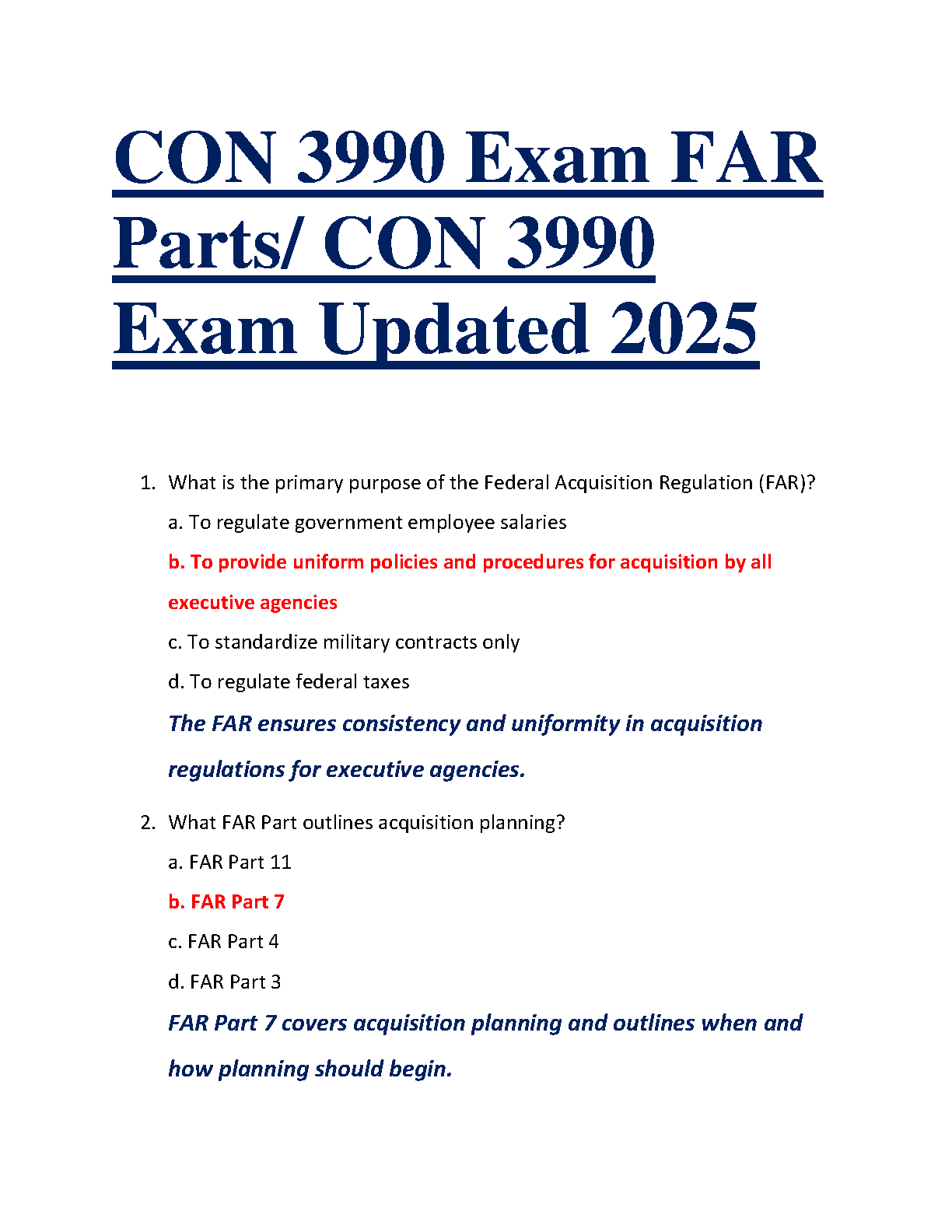 Prepare to excel in your CON 3990 exam with our latest 2025/2026 test bank, specifically focused on the Federal Acquisition Regulation (FAR). This comprehensive study guide provides a complete set of practice questions, each accompanied by a verified answer and a clear rationale. Our expertly crafted materials are designed to give you the confidence and knowledge needed to pass your exam on the very first try, ensuring you master the complexities of government acquisition regulations and avoid the stress of resits.