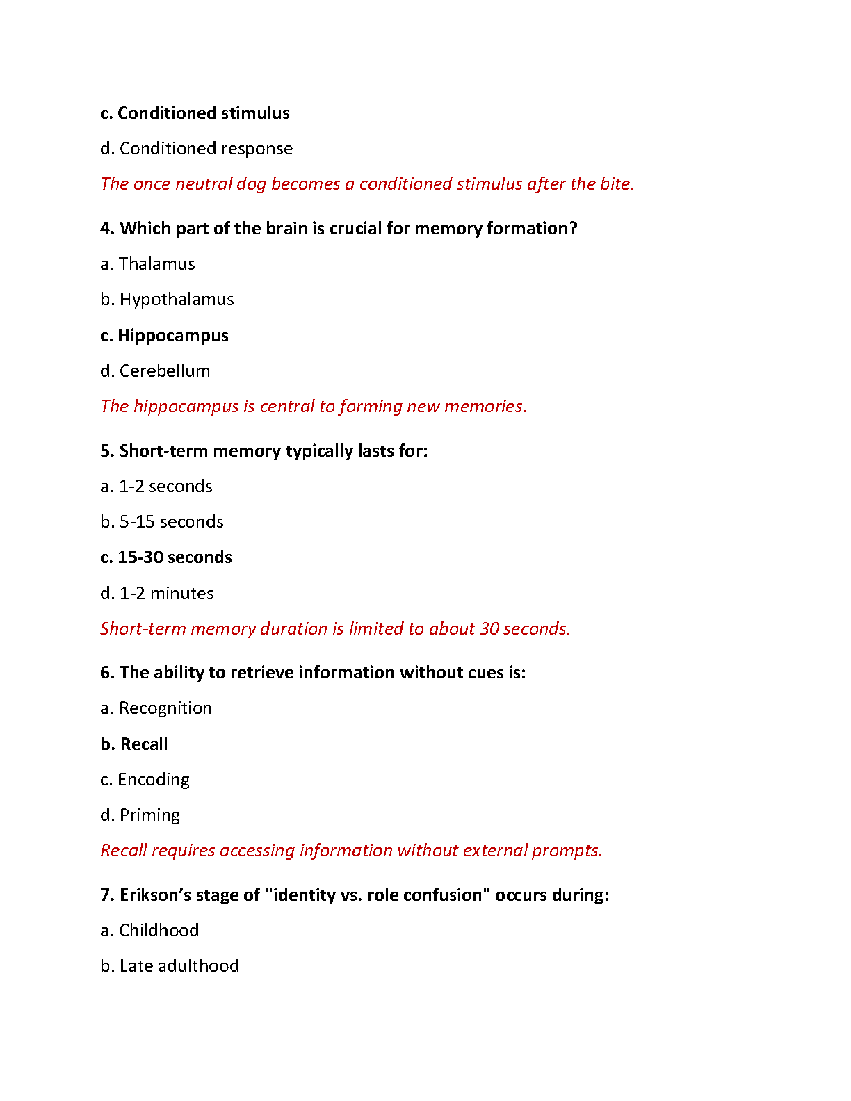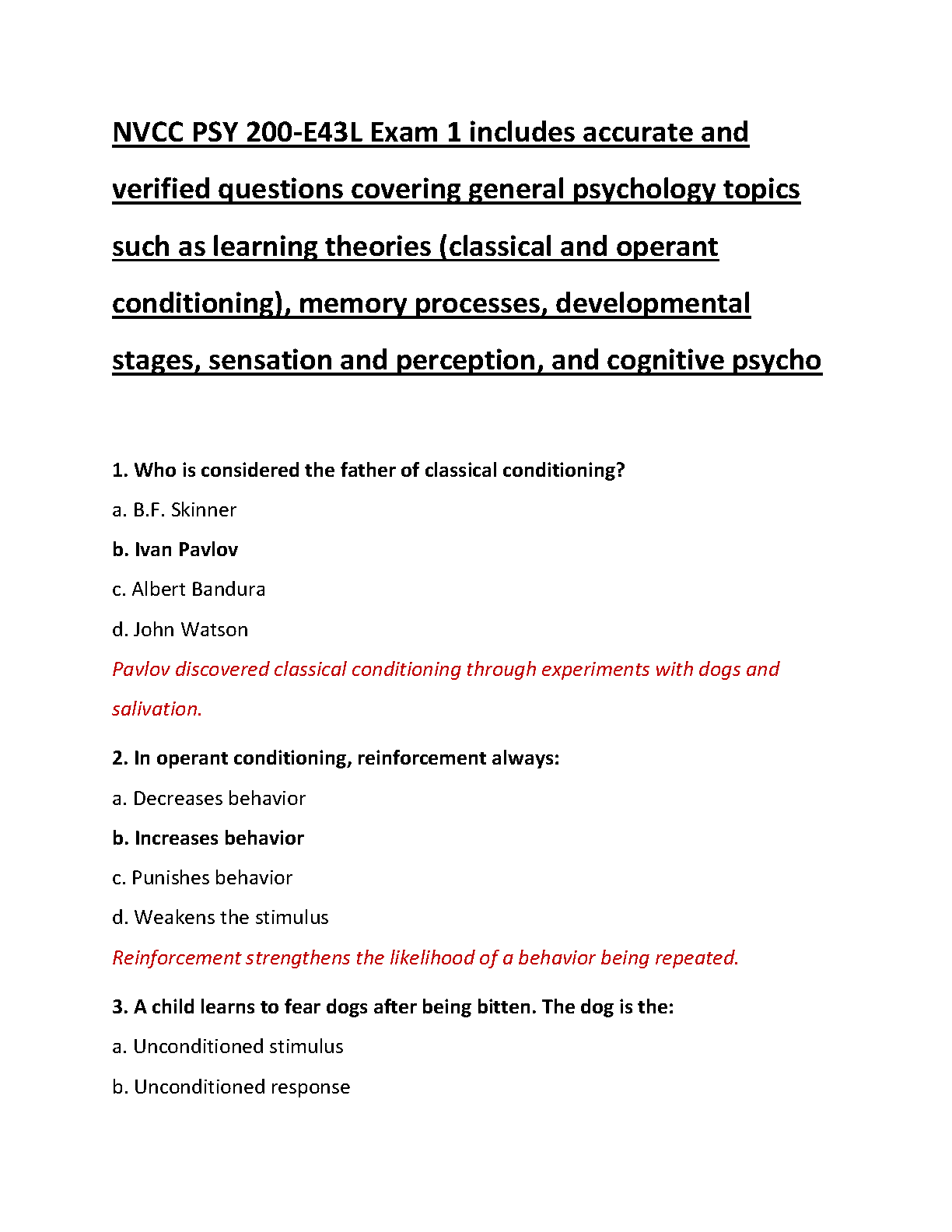 Ace your General Psychology exam with this comprehensive test bank for NVCC PSY 200-E43L Exam 1. This resource features a collection of accurate, verified questions and detailed answers designed to help you master key concepts. The content covers a wide range of essential topics, including learning theories like classical and operant conditioning, memory processes, developmental psychology, sensation and perception, and cognitive psychology. Get the study advantage you need to excel in your course and pass your exam with confidence.