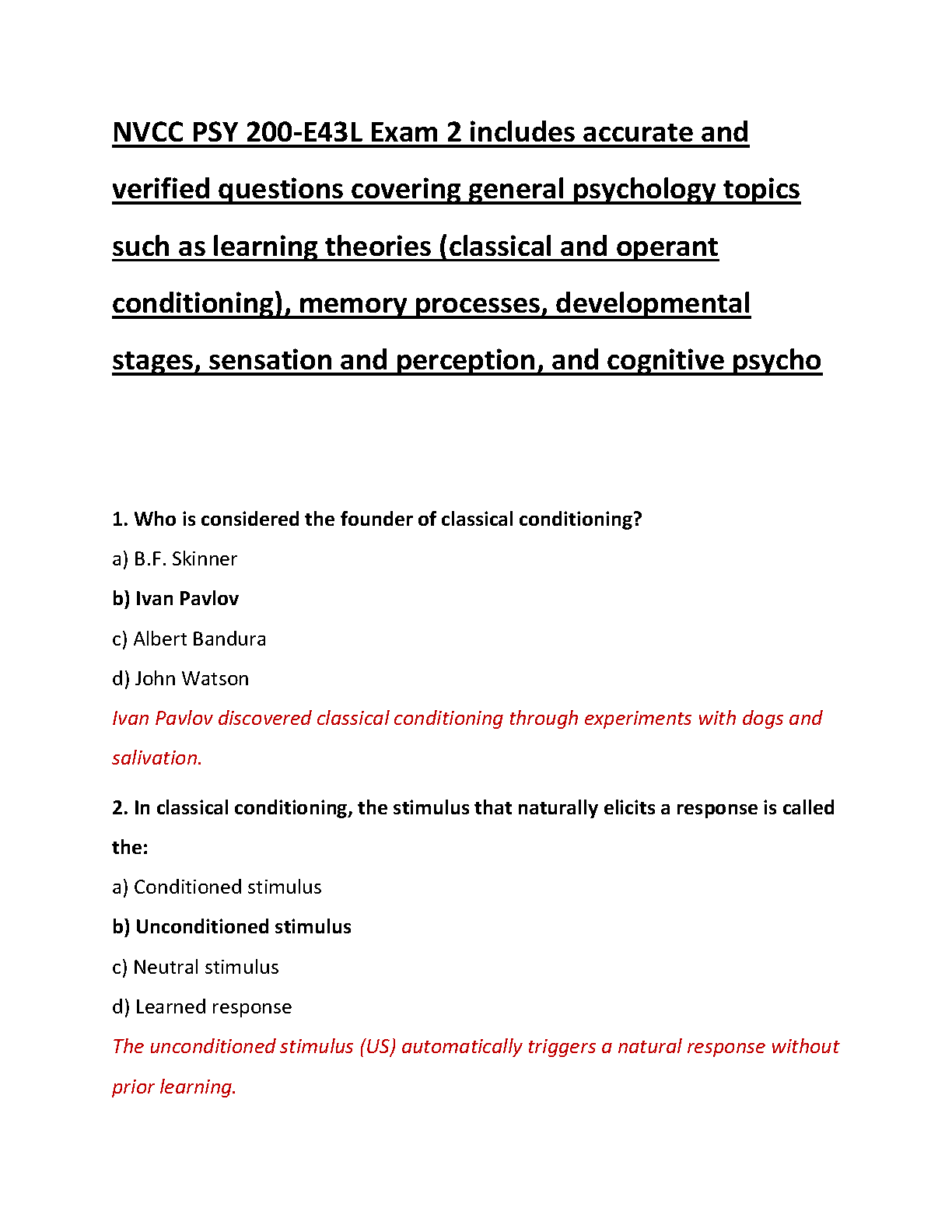 Ace your General Psychology course with this comprehensive test bank for NVCC PSY 200 Exam 2. This invaluable study guide features a complete collection of accurate and verified questions with detailed answers, covering all essential topics. Master key concepts including learning theories like classical and operant conditioning, memory processes, developmental stages, sensation and perception, and cognitive psychology. Prepare effectively, test your knowledge, and confidently pass your exam.