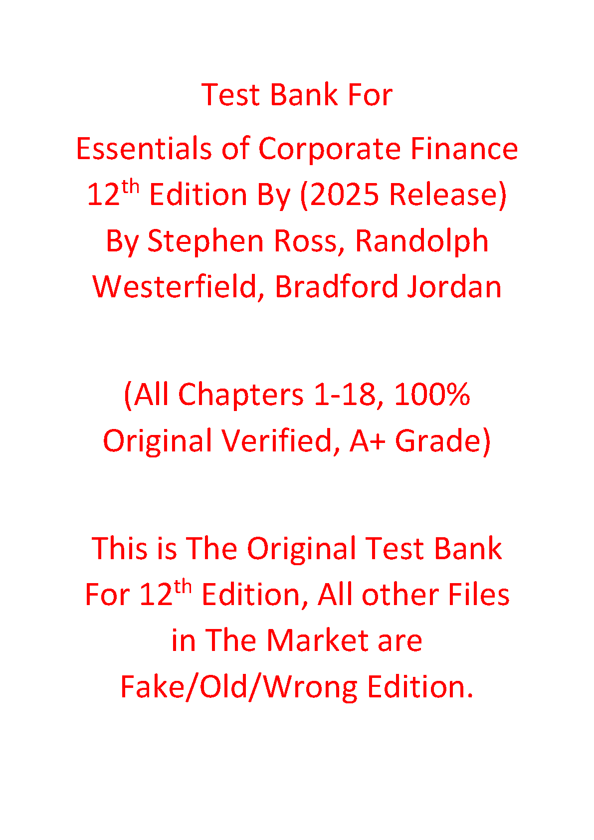Test Bank for Essentials of Corporate Finance, 12th Edition by Stephen Ross, Randolph Westerfield, and Bradford Jordan
