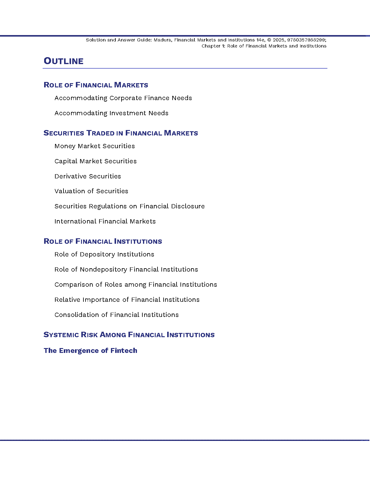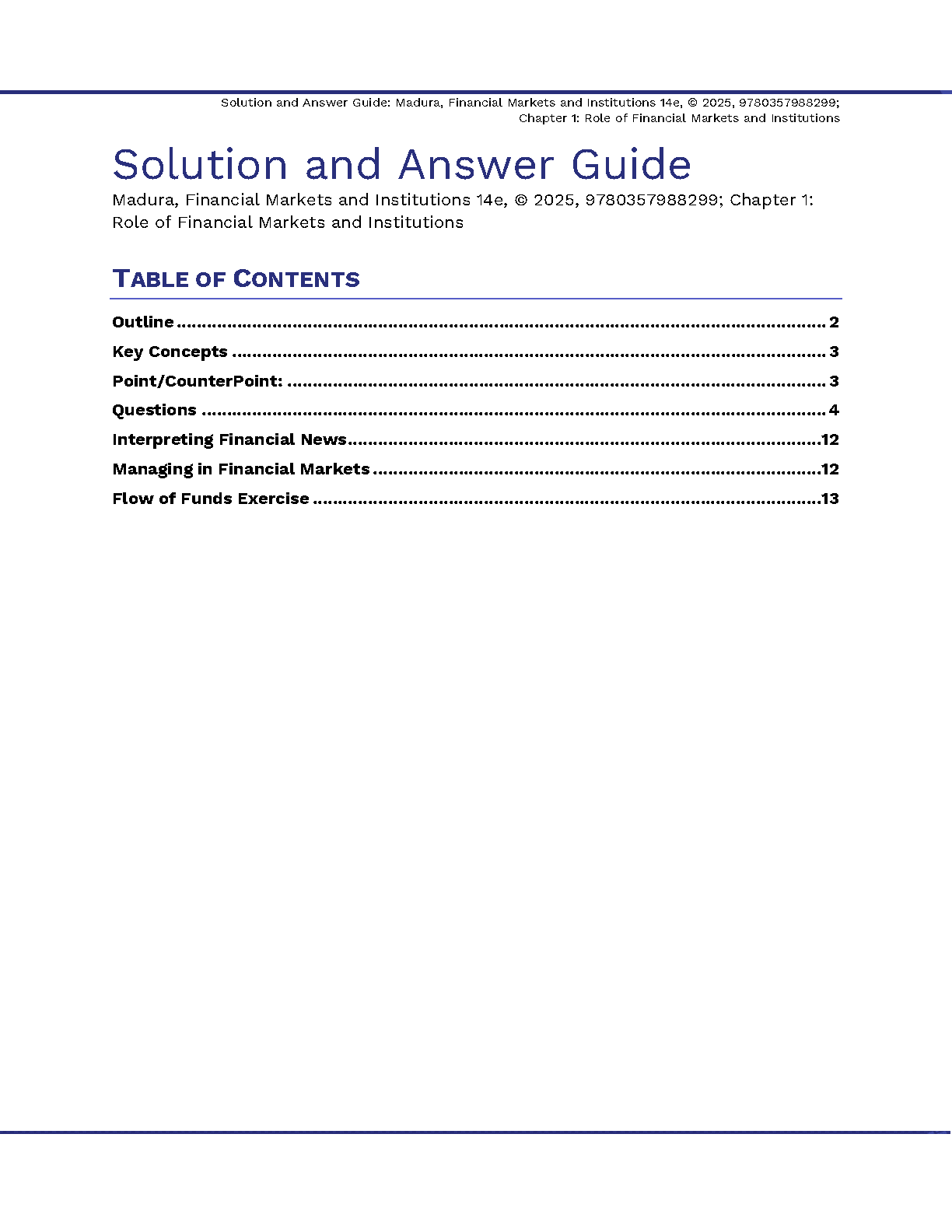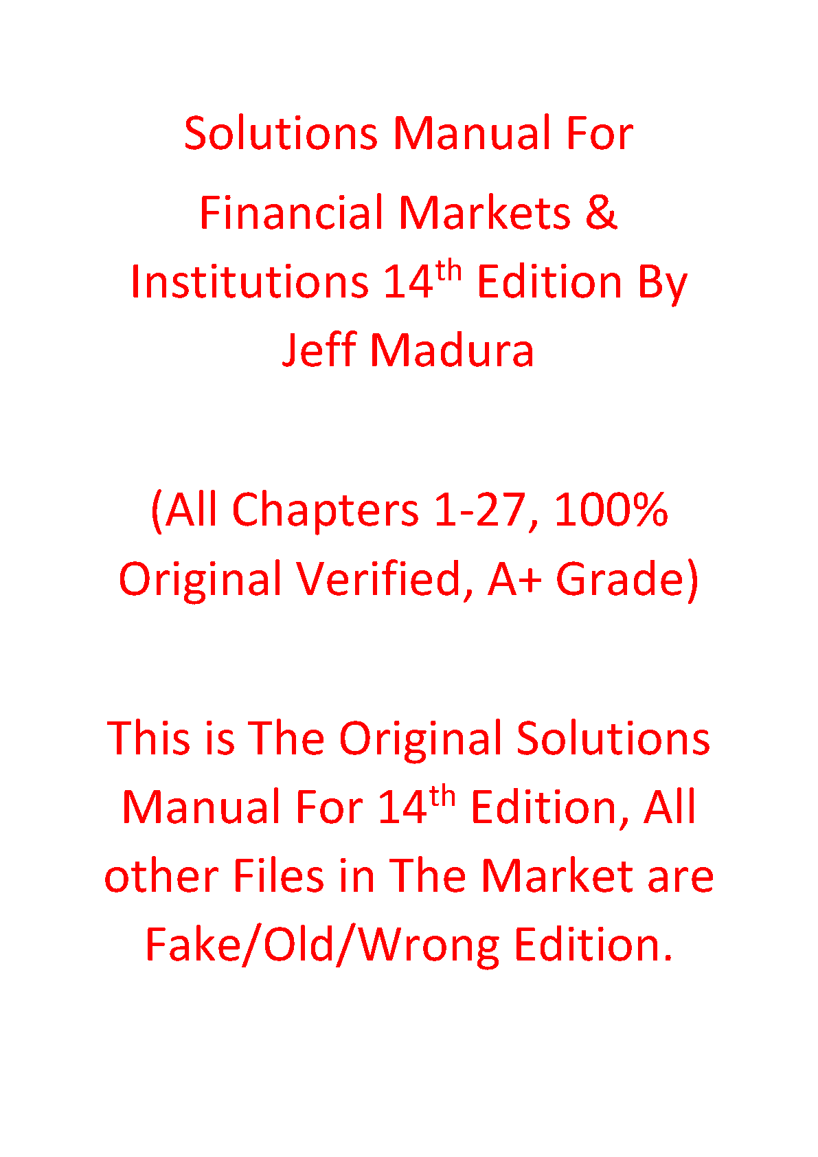 Achieve top grades with the authentic Solutions Manual for Financial Markets & Institutions, 14th Edition by Jeff Madura and Marcia Millon Cornett. This is the ultimate study companion, offering 100% verified and detailed solutions for all chapters from 1 to 27. Unlike other outdated or incorrect files, this original manual provides the accuracy you need to confidently tackle homework and prepare for exams. Master complex financial concepts and ensure you're on the path to an A+.