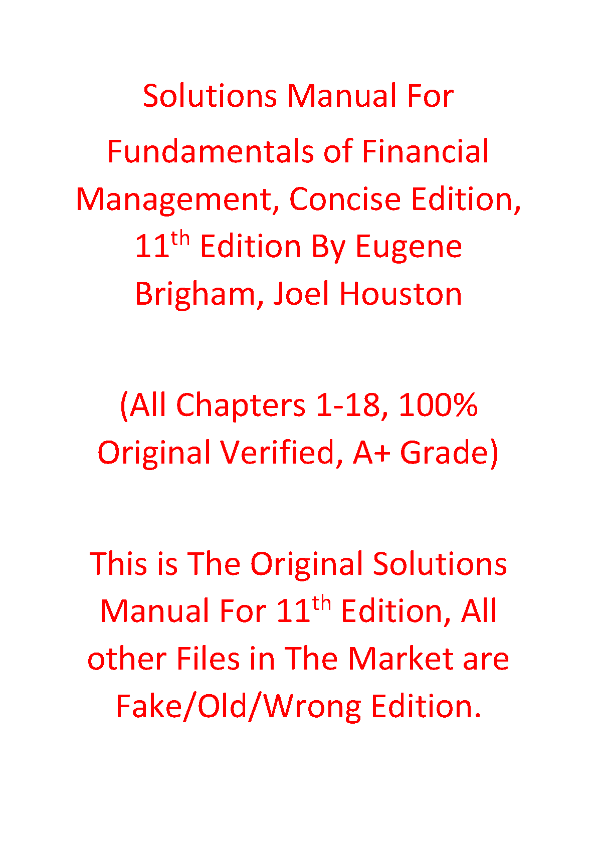 Achieve top grades with the official and verified Solutions Manual for 'Fundamentals of Financial Management, Concise 11th Edition'. Authored by Eugene F. Brigham and Joel F. Houston, this comprehensive guide offers detailed, step-by-step solutions for all chapters (1-18). It is the ultimate resource to master complex financial concepts, confidently complete assignments, and excel in your exams. This is the 100% original, verified manual guaranteed to help you succeed.