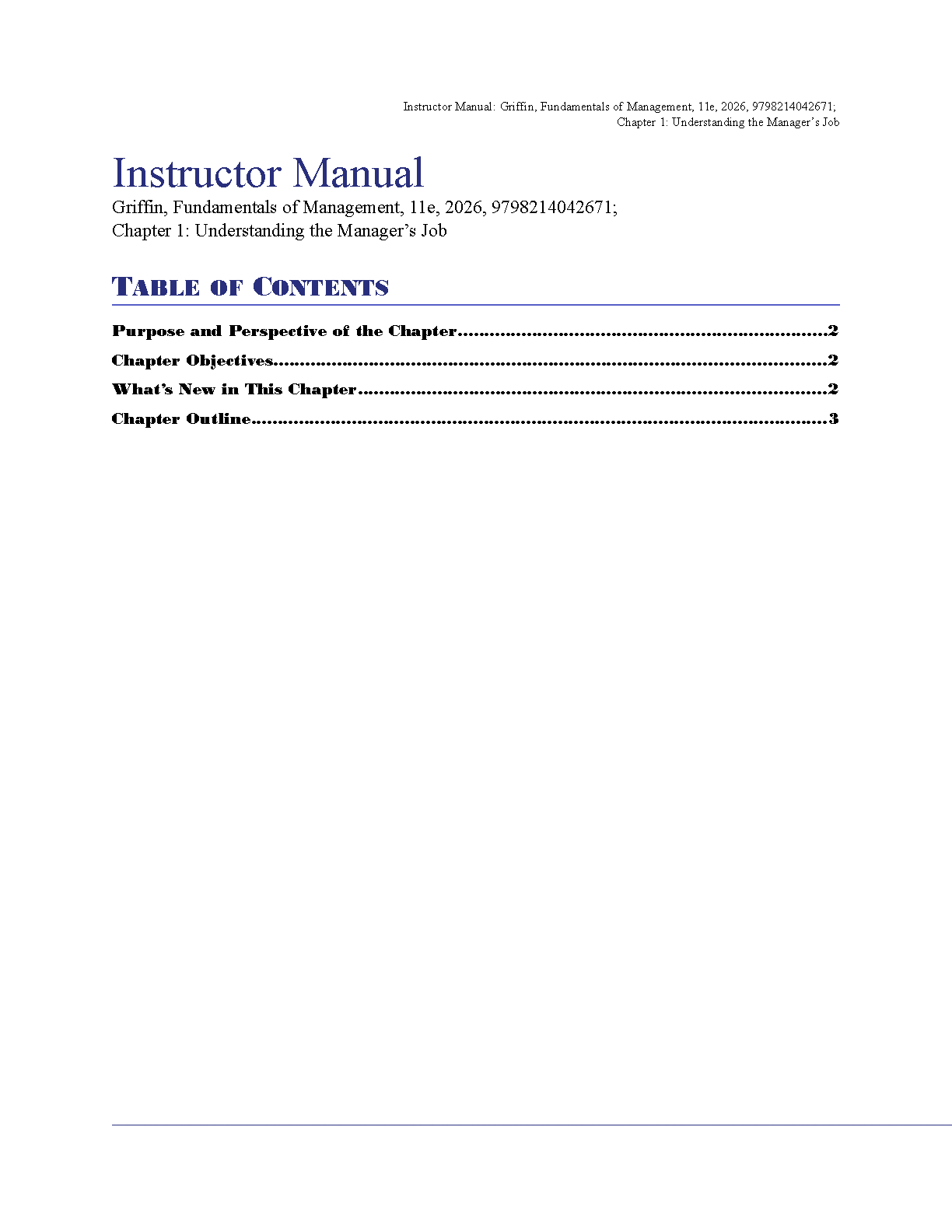 Gain instant access to the complete, official Instructor's Manual for Fundamentals of Management, 11th Edition by the renowned author Ricky W. Griffin. This verified resource covers all chapters from 1 to 15, offering A+ grade, original content directly from the publisher. Unlike other files, this is the authentic 11th edition manual, designed to provide comprehensive support for instructors. Enhance your teaching and student engagement with this essential guide.