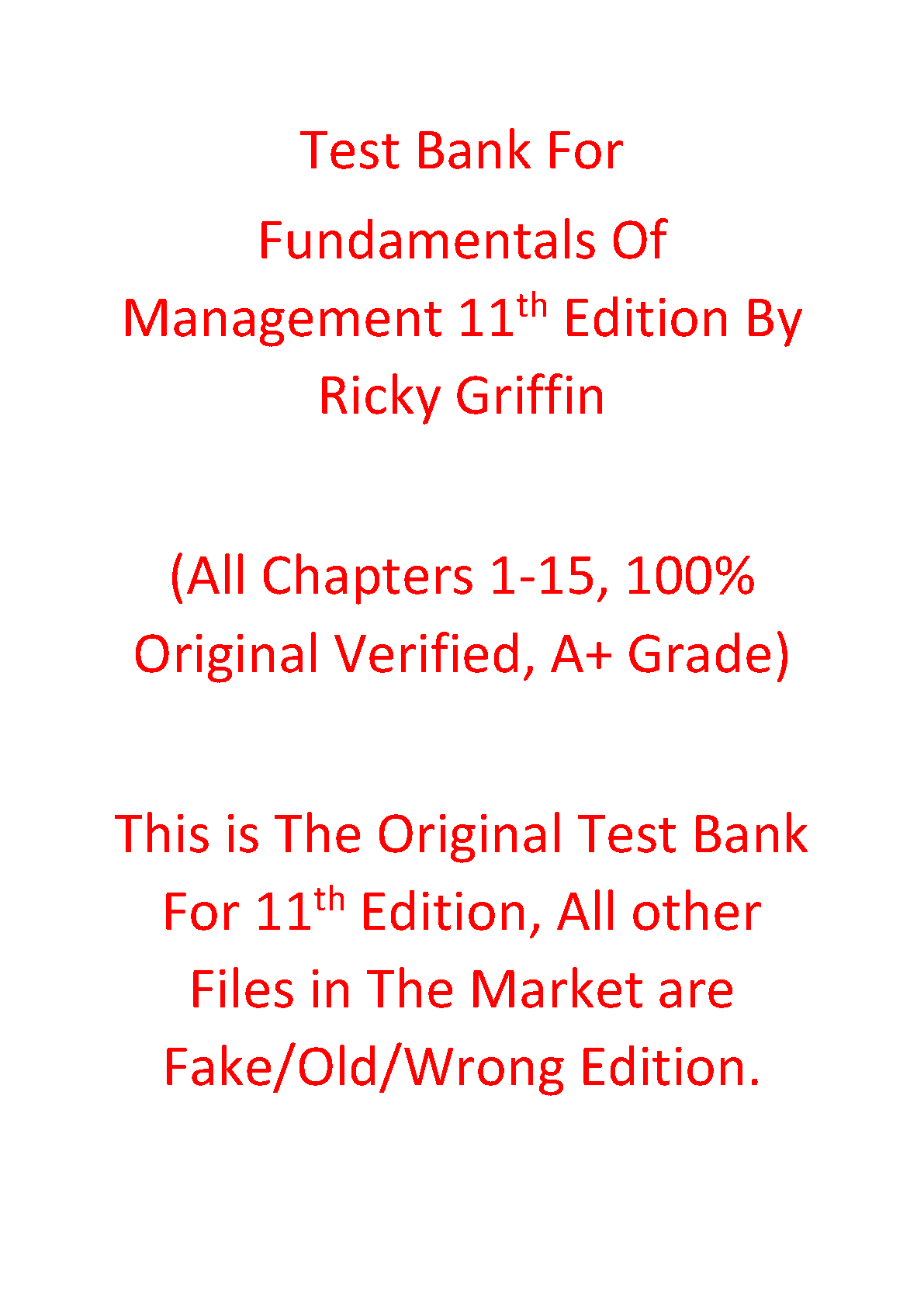 Unlock your potential and ace your management course with the official Test Bank for 'Fundamentals of Management, 11th Edition' by Griffin, Phillips, and Gully. This is the complete, original resource, covering all chapters from 1 to 15. Each question is verified for accuracy, providing you with a reliable study tool to help you achieve an A+ grade. Don't settle for outdated or fake materials; this test bank gives you direct access to the questions and answers that will appear on your exams, ensuring you are fully prepared to succeed.