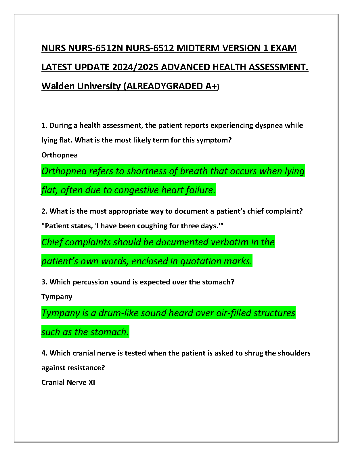 Get the ultimate study advantage for your NURS-6512N / NURS-6512 Advanced Health Assessment midterm at Walden University. This Version 1 test bank is fully updated for the 2024/2025 academic year and includes a comprehensive collection of exam questions paired with 100% correct, A+ graded answers and rationales. Master key topics like patient assessment, diagnostic reasoning, and clinical procedures. This essential resource is designed to help you study smarter, build confidence, and ace your midterm exam on the first try.