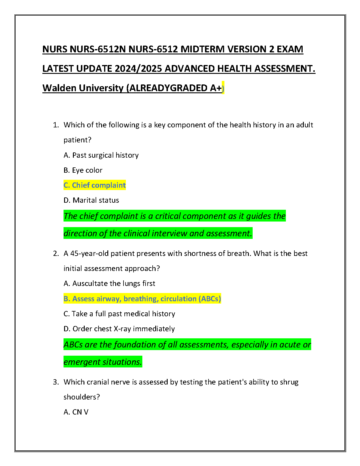 Achieve an A+ on your NURS 6512 Midterm Exam with this comprehensive Version 2 Test Bank for Walden University's Advanced Health Assessment course. This essential study guide is meticulously aligned with the 6th Edition of 'Advanced Health Assessment & Clinical Diagnosis in Primary Care' by authors Joyce E. Dains, Linda Ciofu Baumann, and Pamela Scheibel. It features a complete collection of exam-style questions, each accompanied by the correct, verified answer and a detailed rationale to deepen your understanding. Master critical concepts and confidently prepare for your exam by practicing with this proven resource.