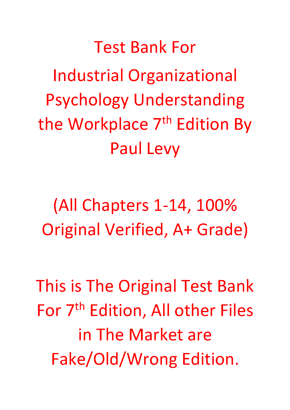 Achieve top grades in your course with the official Test Bank for 'Industrial Organizational Psychology: Understanding the Workplace, 7th Edition' by Paul E. Levy. This comprehensive resource covers all 14 chapters, providing you with authentic, exam-style questions to master key concepts and test your knowledge. Instantly download this verified study guide to effectively prepare for your exams, boost your confidence, and secure an A+ grade. Don't settle for outdated materials; this is the genuine 7th Edition test bank you need for success.