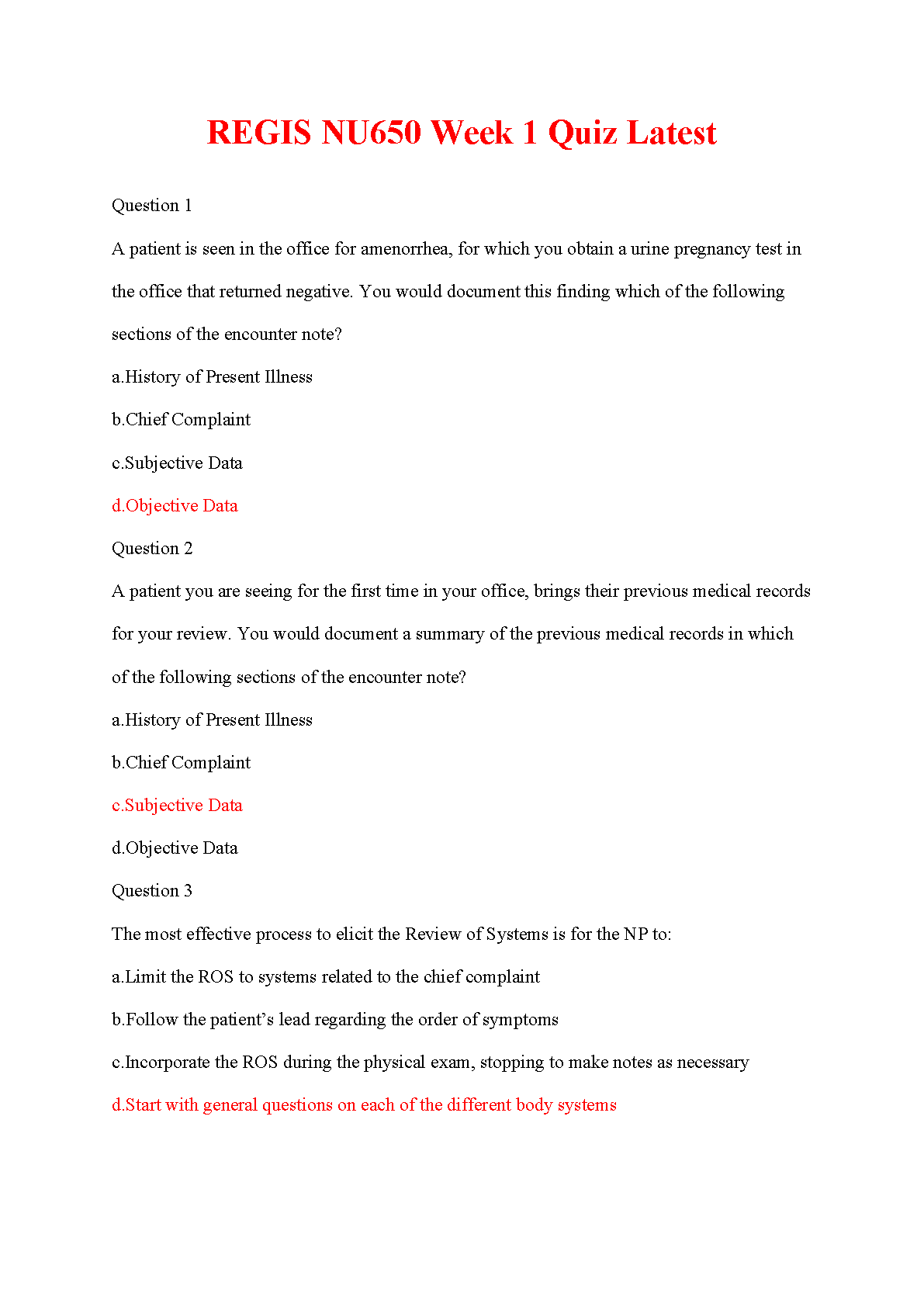 Get instant access to the latest Week 1 Quiz for Regis College's NU650 Advanced Health Assessment course. This comprehensive test bank includes a complete set of questions with verified correct answers, as seen in the preview. It's the perfect study tool to help you master key concepts like patient data documentation (subjective vs. objective), handling previous medical records, and effectively eliciting a Review of Systems. Ace your first quiz and build a strong foundation for the entire course. Ideal for nursing students aiming for top grades and a thorough understanding of advanced health assessment principles.
