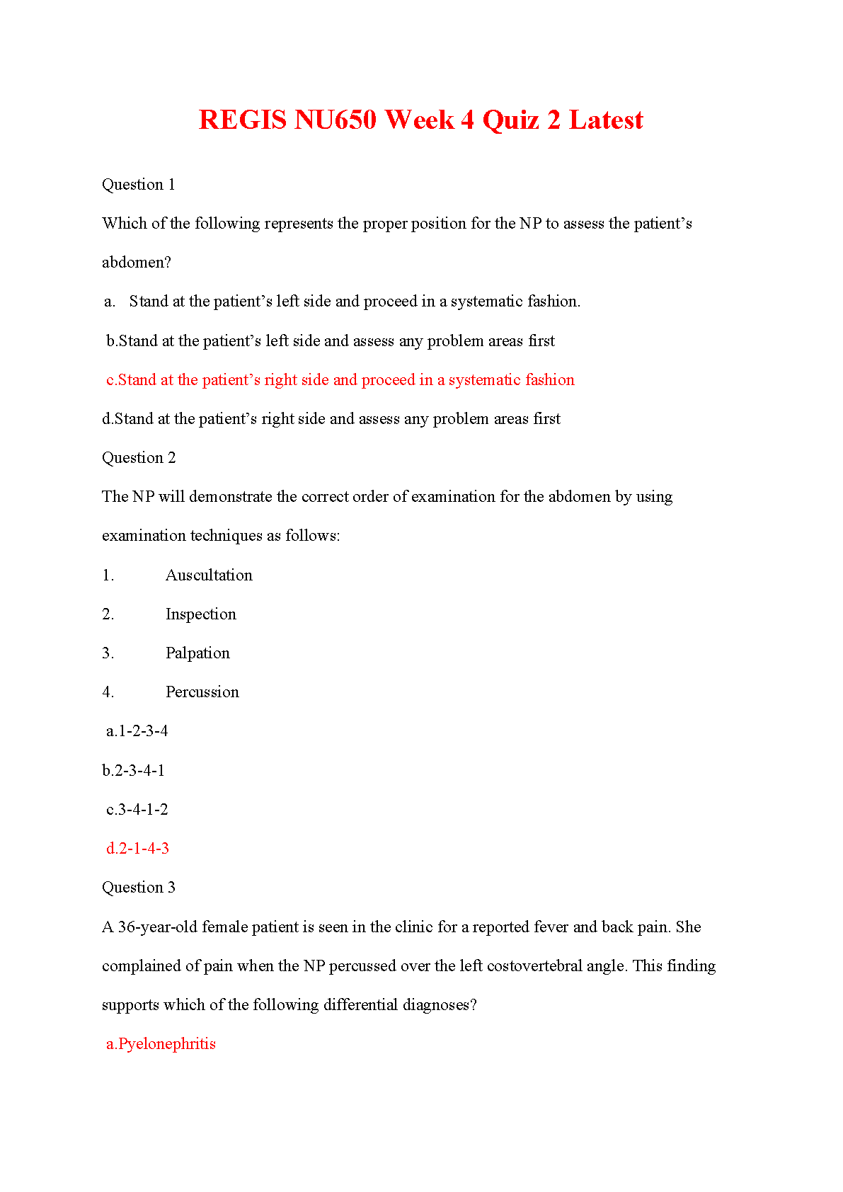 Unlock exam success with the latest 2025/2026 test bank for REGIS NU650 Week 4 Quiz 2. This comprehensive study guide provides detailed questions and 100% correct, verified answers to help you master key concepts in advanced health assessment. Focus your study on crucial topics such as proper abdominal examination procedures, the correct order of assessment techniques (inspection, auscultation, palpation, percussion), and differential diagnosis for conditions like pyelonephritis. This resource is expertly designed to help you pass your exams on the first attempt and avoid resits.
