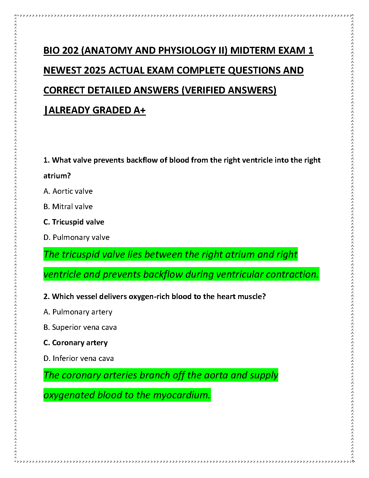 Excel in your BIO 202 Anatomy and Physiology II course with this comprehensive test bank for Midterm Exam 1. This latest 2025/2026 edition is expertly crafted to help you pass on your first attempt and avoid resits. Inside, you'll find a complete set of actual exam questions paired with meticulously verified answers and detailed explanations. This resource covers key topics from the cardiovascular system and more, ensuring you have a deep understanding of the material. Prepare with confidence and aim for that A+ grade with this proven study tool!