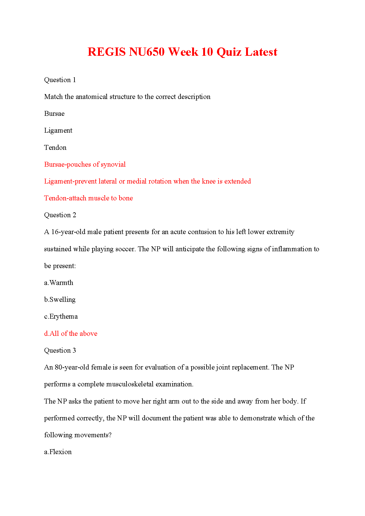 Unlock immediate success in your NU650 Advanced Health Assessment course with our comprehensive test bank for the Week 10 Quiz. This latest, verified resource provides a full set of questions with detailed, correct answers, focusing on critical topics like musculoskeletal anatomy, inflammation signs, and patient assessment techniques. Aligned with the 'Advanced Health Assessment & Clinical Diagnosis in Primary care, 6th Edition' by Dains, Baumann, & Scheibel, this study aid is expertly designed to help you understand complex concepts, prepare effectively, and secure a top grade on your quiz.