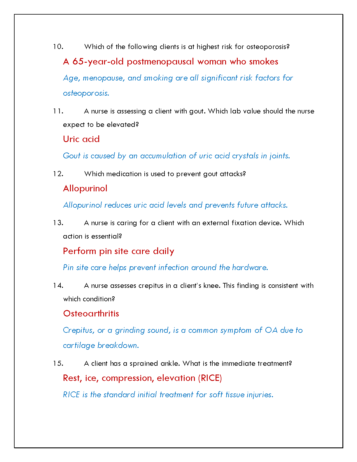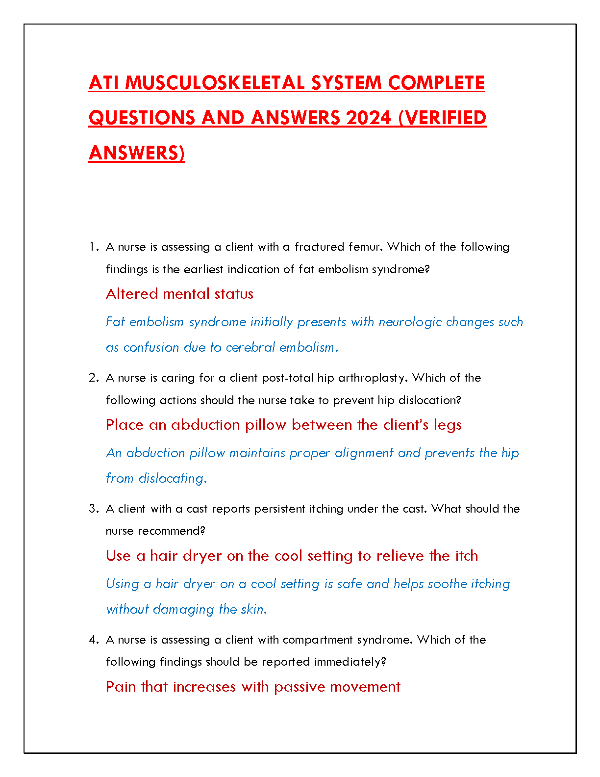 Master the ATI RN Musculoskeletal System Proctored Exam with our comprehensive 2025-2026 test bank. This guide features a complete collection of verified questions, accompanied by detailed answers and in-depth rationales to ensure you fully understand the core concepts. Designed specifically for nursing students, this resource is your ultimate tool for effective exam preparation, helping you to pass confidently on your first attempt and avoid resits. Elevate your studies and secure your success in musculoskeletal nursing.