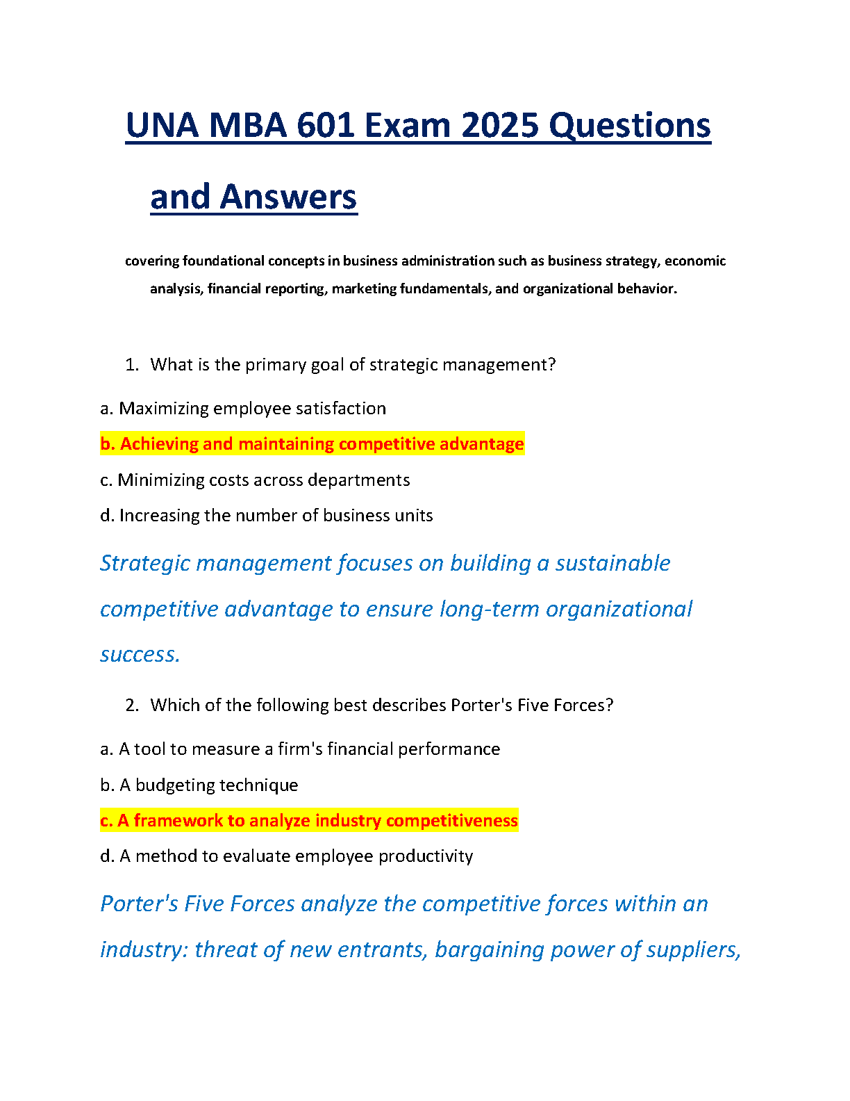 Unlock academic excellence in your UNA MBA 601 course with our newly released 2025/2026 exam preparation guide. This comprehensive resource is packed with the latest exam questions and meticulously verified answers, covering all essential business administration concepts. Dive deep into topics like strategic management, Porter's Five Forces, financial reporting, marketing fundamentals, and organizational behavior. Designed to help you master the material efficiently, this guide is your key to passing the exam on your first attempt and avoiding costly resits.