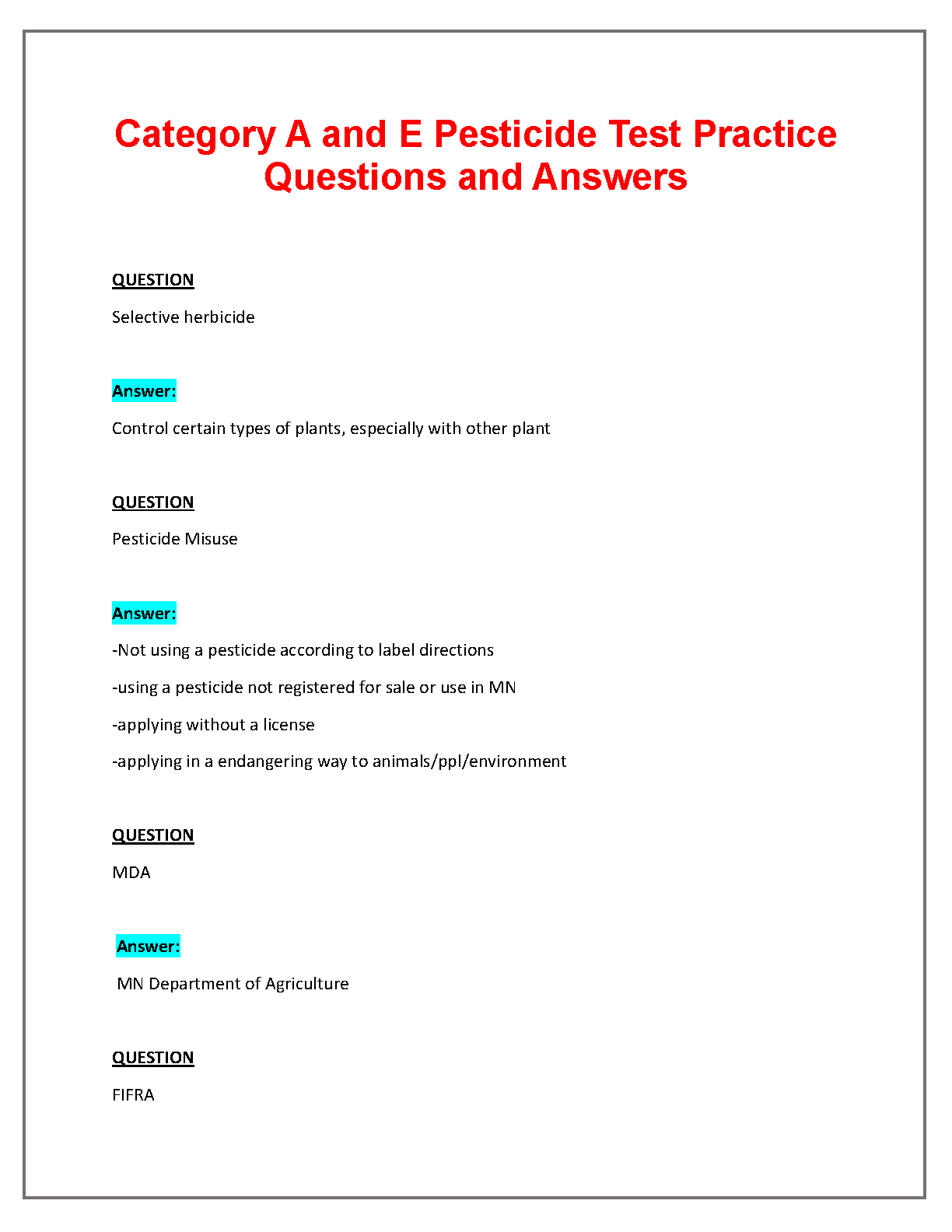 Ace your pesticide applicator certification with our latest 2025/2026 Test Bank for Category A (Core) and Category E (Turf & Ornamentals). This comprehensive study guide is packed with practice questions and detailed, verified answers that mirror the actual exam format. Master crucial topics such as selective herbicides, pesticide misuse regulations, the role of the Department of Agriculture (MDA), and FIFRA guidelines. Designed to ensure you pass on your first attempt, this resource is your key to avoiding costly resits and beginning your career as a certified applicator. Download now for immediate access to the ultimate exam preparation tool.