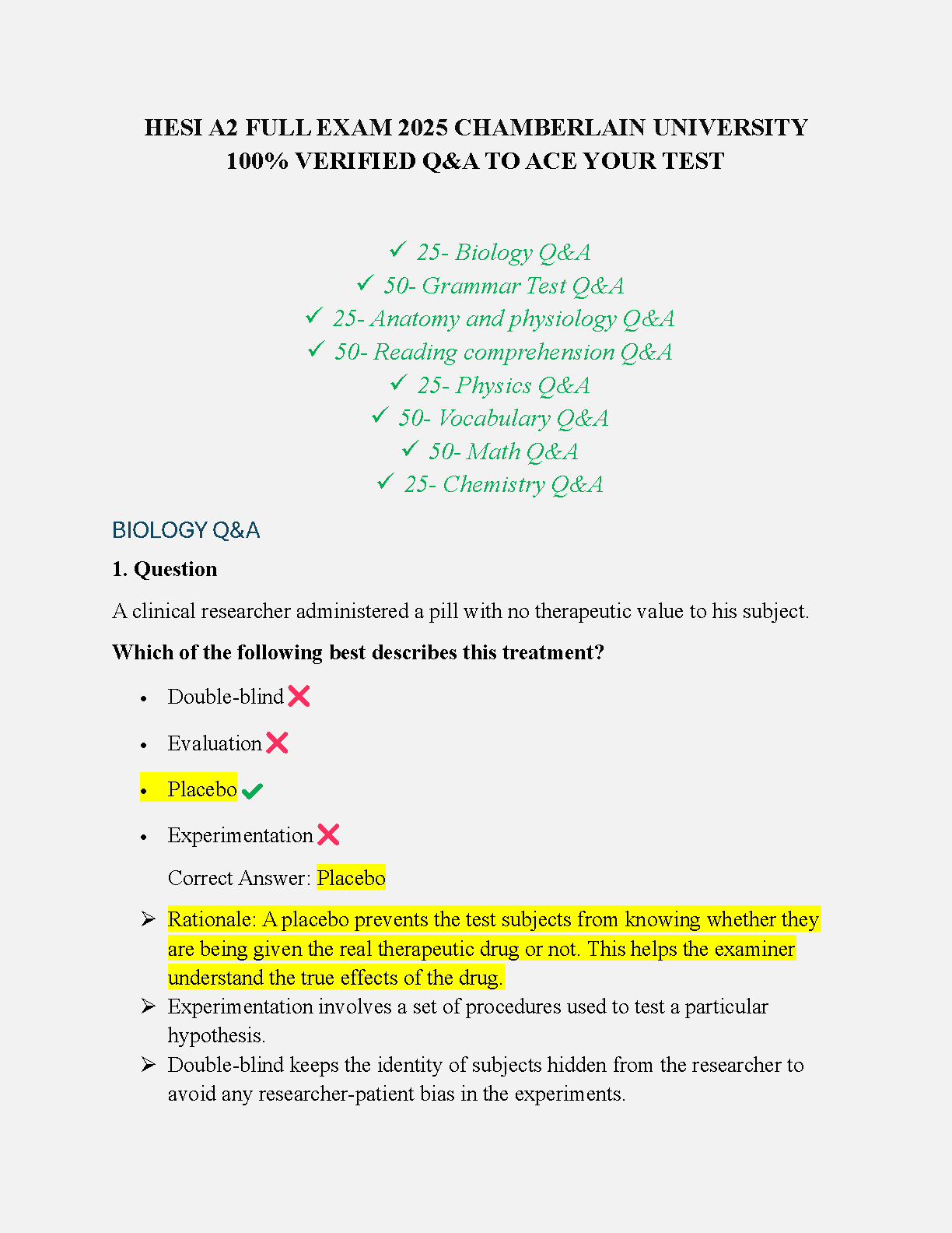Get fully prepared for your HESI A2 entrance exam with this comprehensive study guide tailored for Chamberlain University students for the 2025 academic year. This guide contains a complete set of 100% verified questions and answers with detailed rationales, covering all essential subjects: Biology, Grammar, Anatomy & Physiology, Reading Comprehension, Physics, Vocabulary, Math, and Chemistry. Master the material, understand the reasoning behind each answer, and walk into your exam with the confidence to succeed. This is your ultimate tool to ace the HESI A2 test!