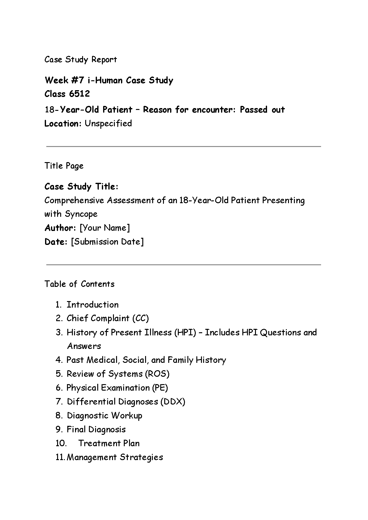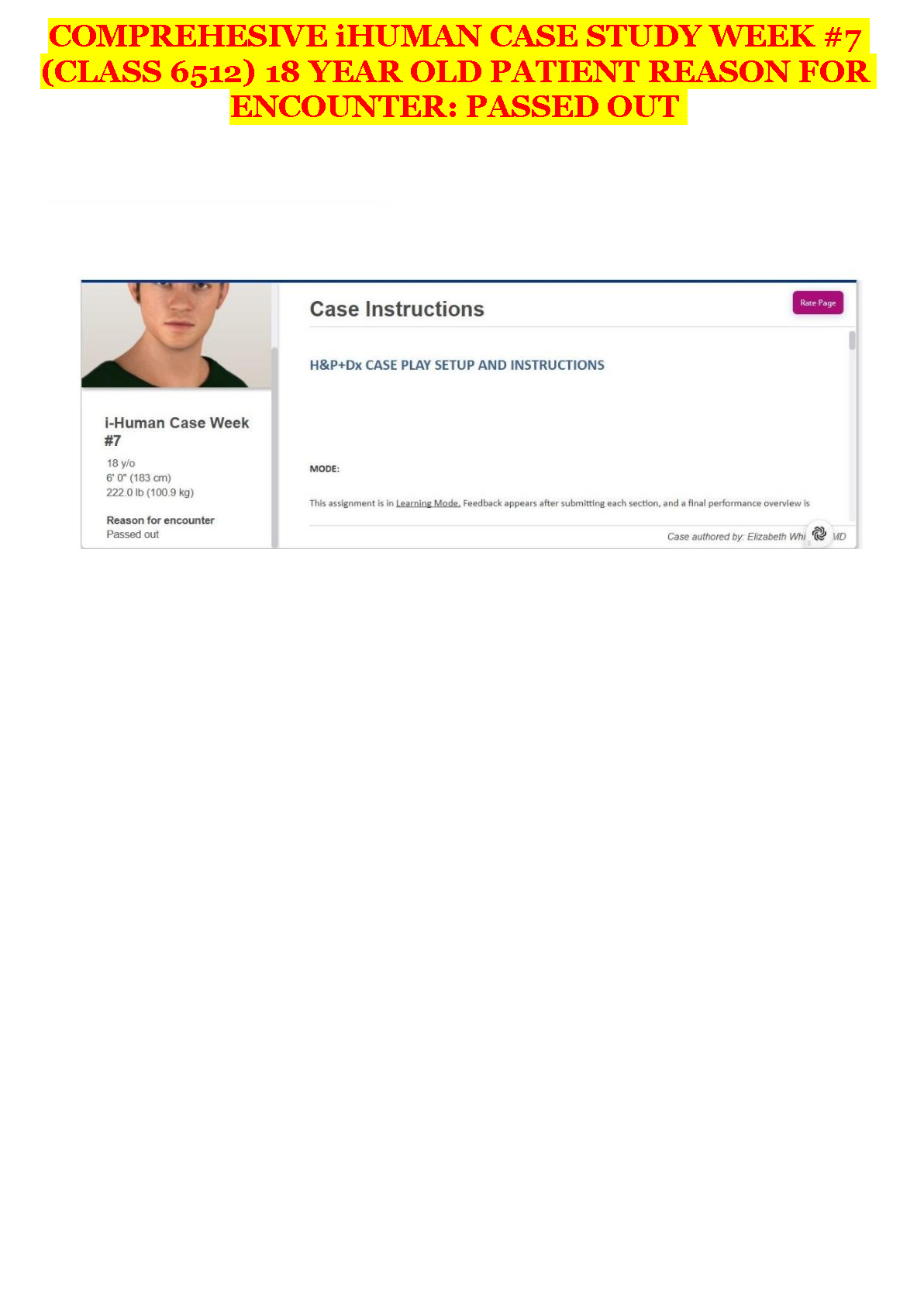Unlock success in your medical or nursing program with our comprehensive guide to the iHuman Case Study for Week 7, featuring an 18-year-old patient who 'Passed Out.' Authored by Elizabeth White, MD, this detailed resource covers the complete H&P+Dx for the syncope encounter from Class 6512. This latest 2025/2026 edition is meticulously crafted to provide you with the key findings, differential diagnoses, and management plan needed to excel. Master this challenging case study, boost your clinical reasoning skills, and pass your exams on the first try, avoiding costly resits.