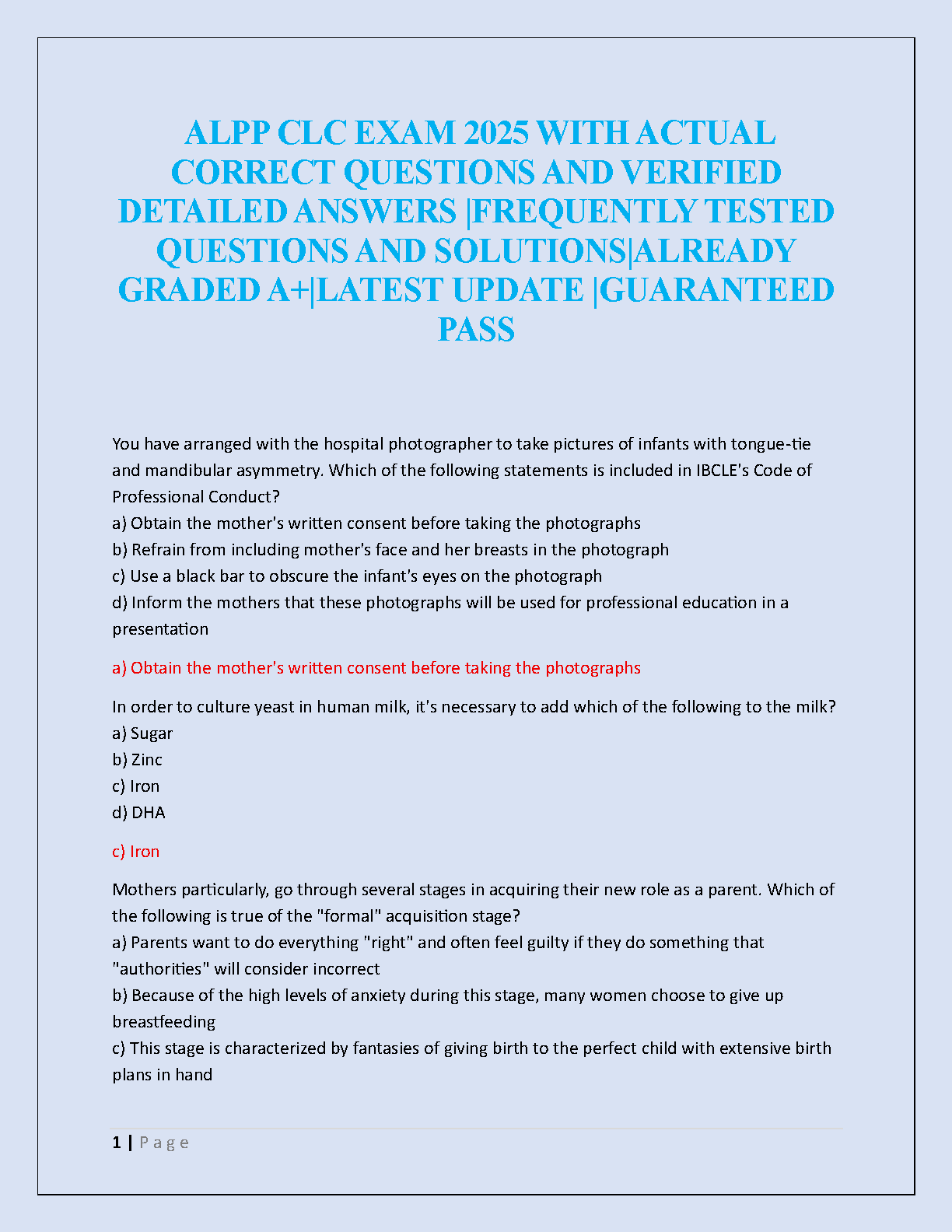 Master the ALPP Certified Lactation Counselor (CLC) Exam with our latest 2025 test bank. This comprehensive resource is packed with a wide array of frequently tested questions, each accompanied by verified, detailed answers to ensure you have a deep understanding of the material. Designed for a guaranteed pass and an A+ grade, our study guide covers all essential topics, from professional conduct and infant health to maternal psychology. Say goodbye to exam anxiety and avoid resits by preparing with the most up-to-date and accurate questions and solutions available for the 2025/2026 academic year.
