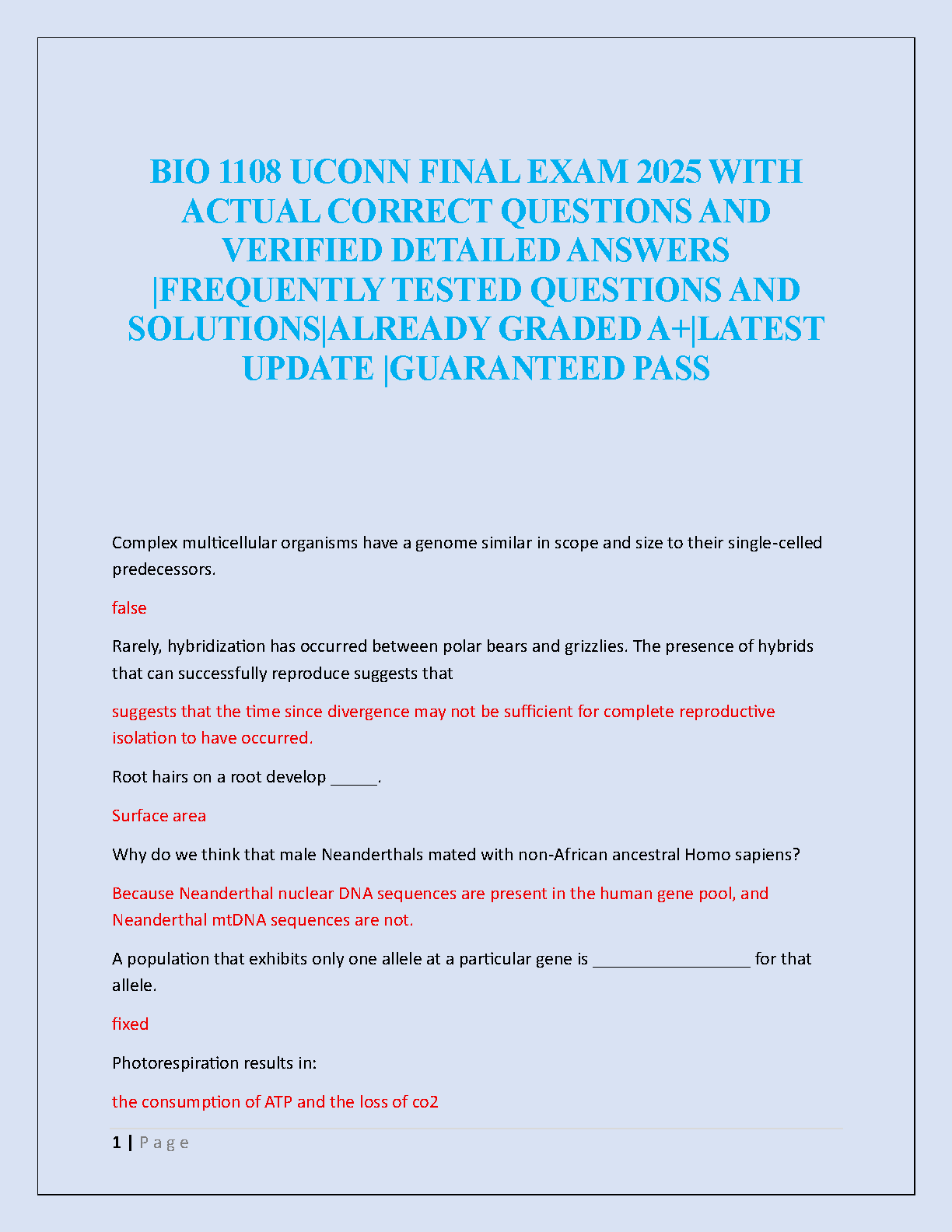 Achieve top marks in your BIO 1108 Final Exam at UConn with our newly updated 2025 test bank. This comprehensive resource is tailored to the textbook 'Principles of Biology,' 4th Edition by Brooker, Widmaier, Graham, and Stiling. It features a complete collection of actual, frequently appearing exam questions with detailed, verified answers, already proven to secure A+ grades. This is the ultimate study guide to help you master the course material, pass your exam on the first attempt, and avoid any chance of a resit. Download now for a guaranteed path to success in the 2025/2026 academic year.